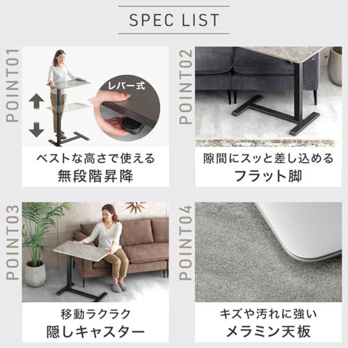 【スタッフのおすすめポイント】暮らしに寄り添う昇降マルチテーブル ・ベストな高さで使える無段階昇降 ・ソファ下やベッド下に差し込みやすいフラット脚 ・移動ラクラク360隠しキャスター ・キズや汚れに強いメラミン天板 ・フレームはサビに強い粉体塗装仕上げ