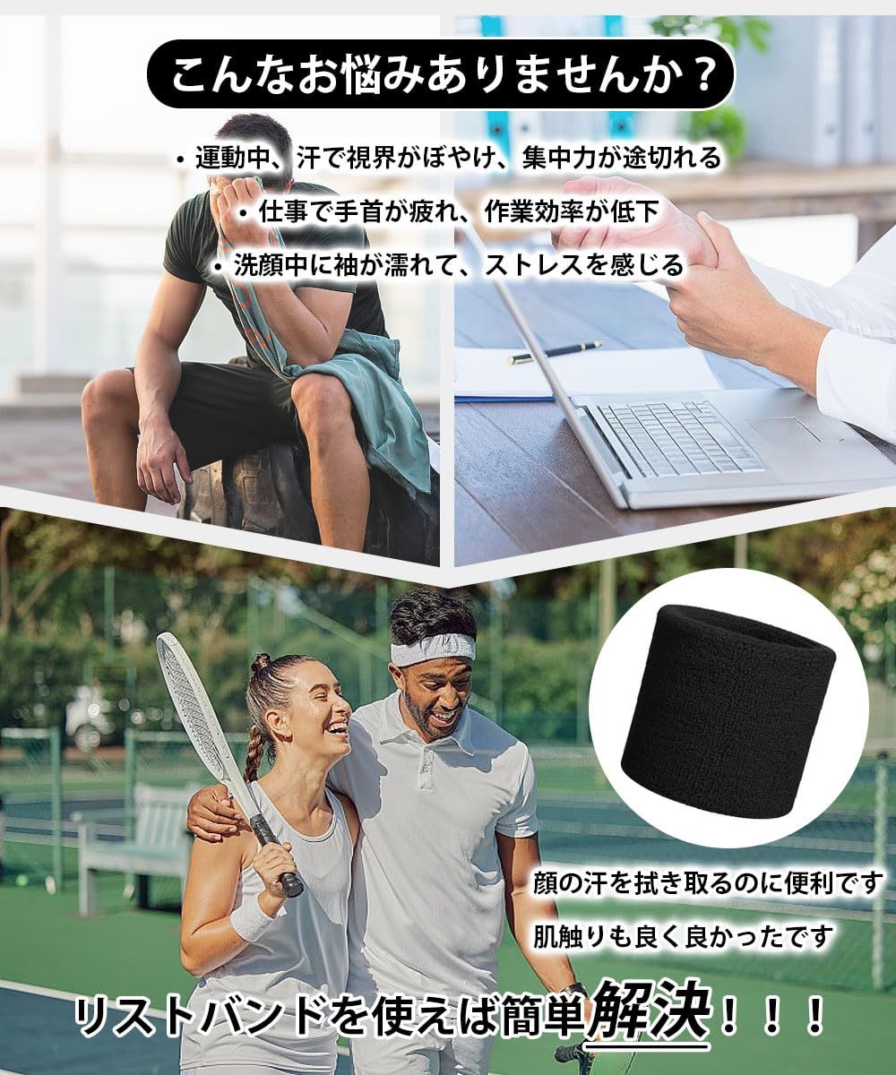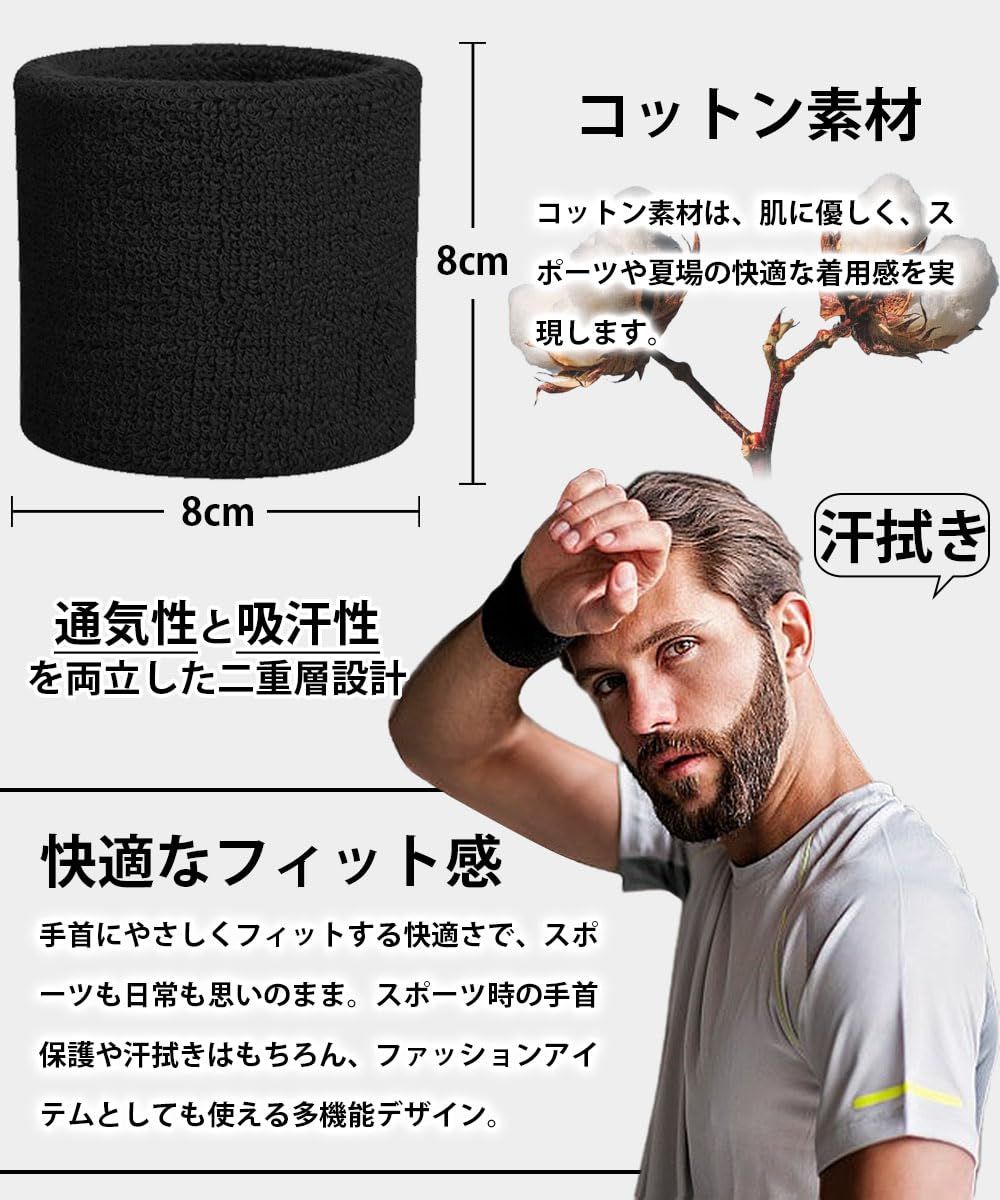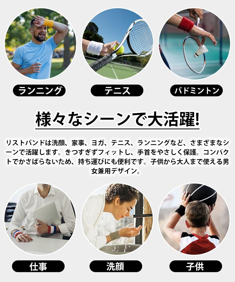 【吸汗性抜群】このリストバンドは、運動中の手首の汗をしっかり吸収するだけでなく、タオル代わりに顔の汗を拭くのにも便利です。また、洗顔や手洗い時に水が腕に広がったりこぼれたりするのを軽減・防止し、袖口を濡らしません。