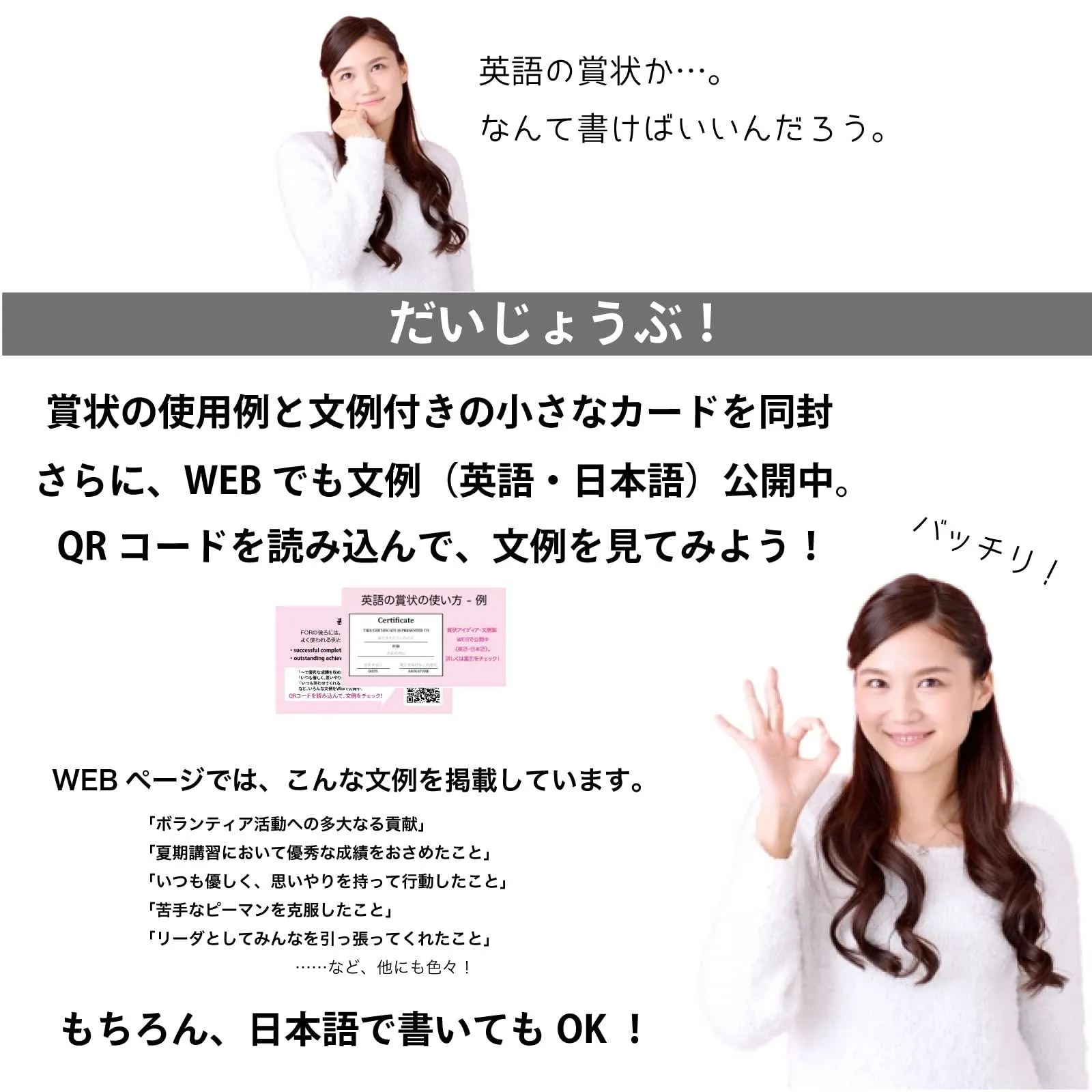 使用例・文例付きの小さなカードを同封。さらにQRコードを読み込めば、もっとたくさんの文例が見れる。