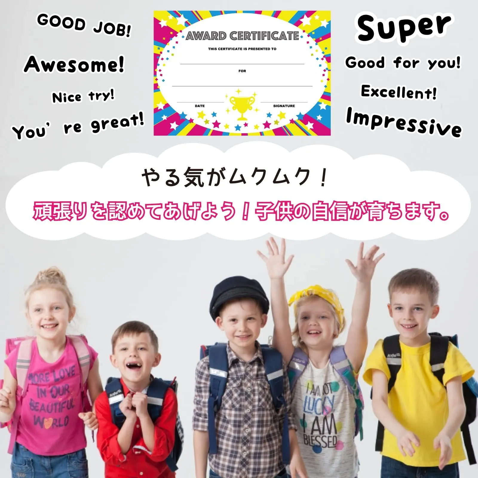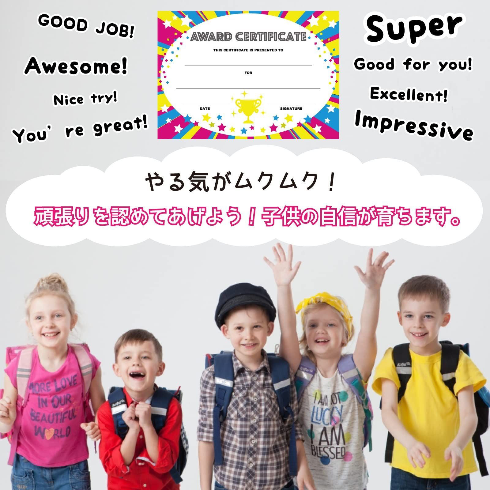 英語の賞状 表彰状 ポップデザイン award certificate カード 英語の文例付き QRコード 表彰状 子ども キッズ 大容量 POP (30枚)