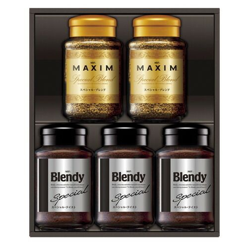 まずはストレートで楽しみたい「マキシム」と、ミルクをたっぷり入れて深いコクのカフェオレが楽しめる「ブレンディ」をセットにした、インスタントコーヒーのバラエティギフトです。