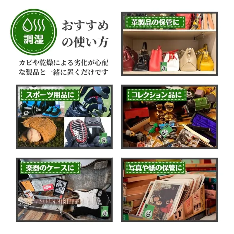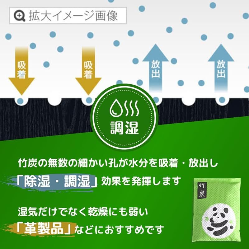 【湿度をコントロール】竹炭には目に見えない無数の細かい孔があり、その孔が空気中の水分を吸着し「除湿効果」を発揮します。また、除湿だけではなく、乾燥してくると吸収した水分を放出するため「調湿効果」もあります。湿気だけでなく乾燥にも弱い革製品や紙製品、精密機器などの保管にもご利用ください。