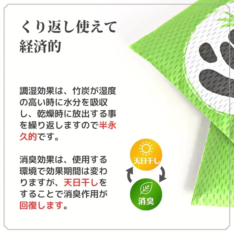 【くり返し使えて経済的】竹炭は「調湿効果」は半永久的に、「消臭効果」は天日干しすることで回復しますのでくり返しお使いいただけます。お使いいただく環境で変わりますが、1~2年はお使いいただけます。
