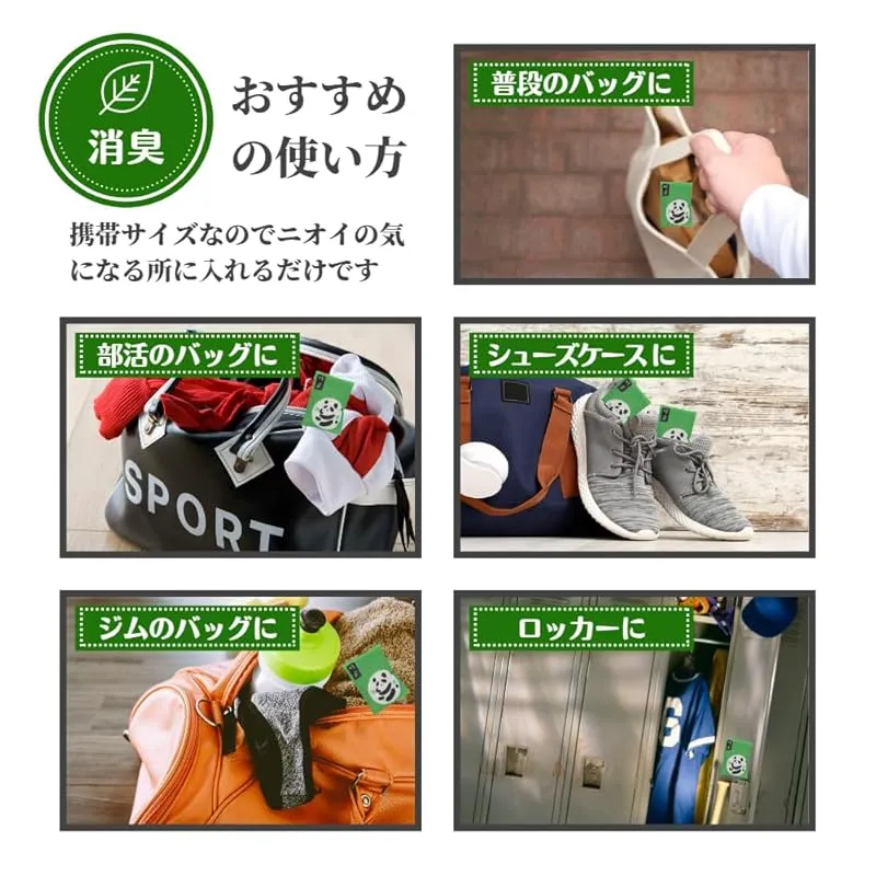 【いろいろ使えて便利】コンパクトなサイズなので、普段のバッグや部活・ジム用のニオイが気になるバッグにお使いいただけます。また、革製品などの大切なモノを保管する際にもおすすめです。靴や靴箱、車、トイレ、衣服・たんす・冷蔵庫、パントリー、ロッカーなど色々な所でお使いいただけます。