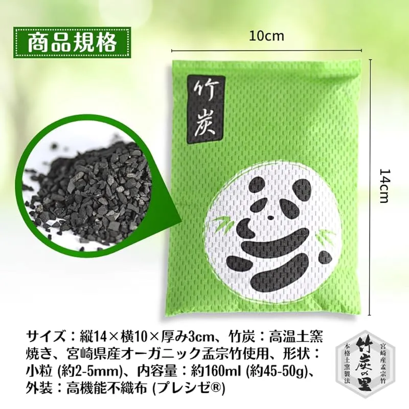 【商品詳細】竹炭の里 調湿・消臭用竹炭、サイズ:縦14×横10×厚み3cm、竹炭:高温土窯焼き、宮崎県産オーガニック孟宗竹使用、形状:小粒 (約2-5mm)、内容量:約160ml (約45-50g)、外装:高機能不織布 (プレシゼ)