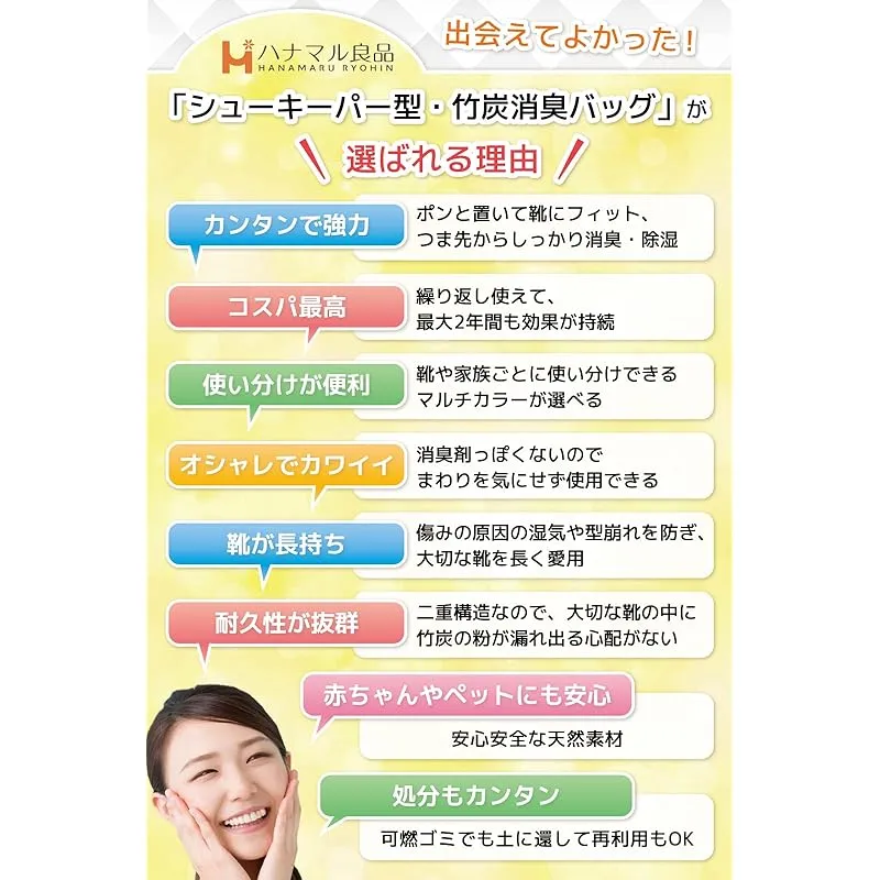 【ハナマル良品 シューキーパー型 靴 消臭 脱臭 竹炭 バッグ セット内容】竹炭バッグ「75g/個」(サイズ:約縦16cm×幅6.5cm×厚さ8cm/個)、説明書(脱臭・除湿の効果アップ実践法付き)