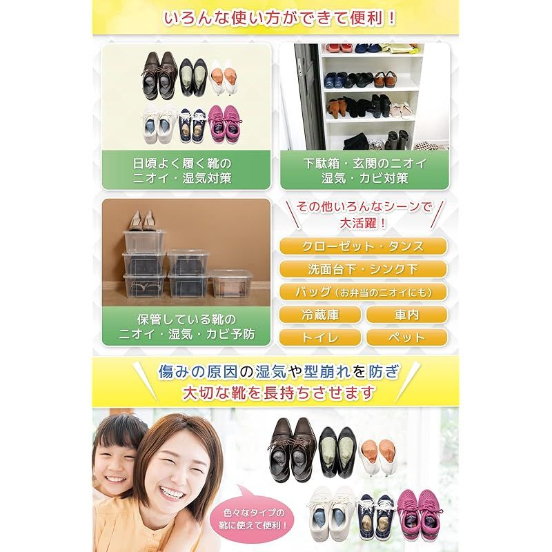 【いろんなシーンで大活躍】シューキーパー 型なので、靴の形にピッタリフィットし、つま先までしっかり 清潔 で 型崩れ を防ぎます。靴 乾燥剤 消臭剤 以外でも、靴箱 下駄箱 タンス クローゼット 衣装ケース お弁当などを入れたバッグ スーツケース 車 ペット トイレ 洗面台下 シンク下 冷蔵庫 ロッカー などにのさまざまな気になる場所に効果を発揮し、ポンと置くだけで使い方も超カンタン。