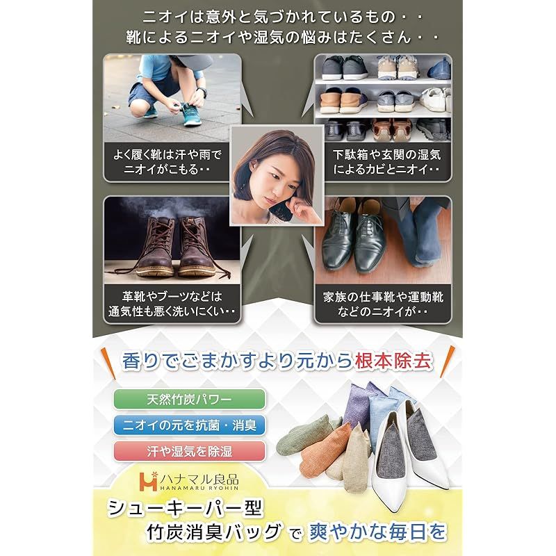 【ハナマル良品 シューキーパー型 靴 消臭 脱臭 竹炭 バッグ セット内容】竹炭バッグ「75g/個」(サイズ:約縦16cm×幅6.5cm×厚さ8cm/個)、説明書(脱臭・除湿の効果アップ実践法付き)