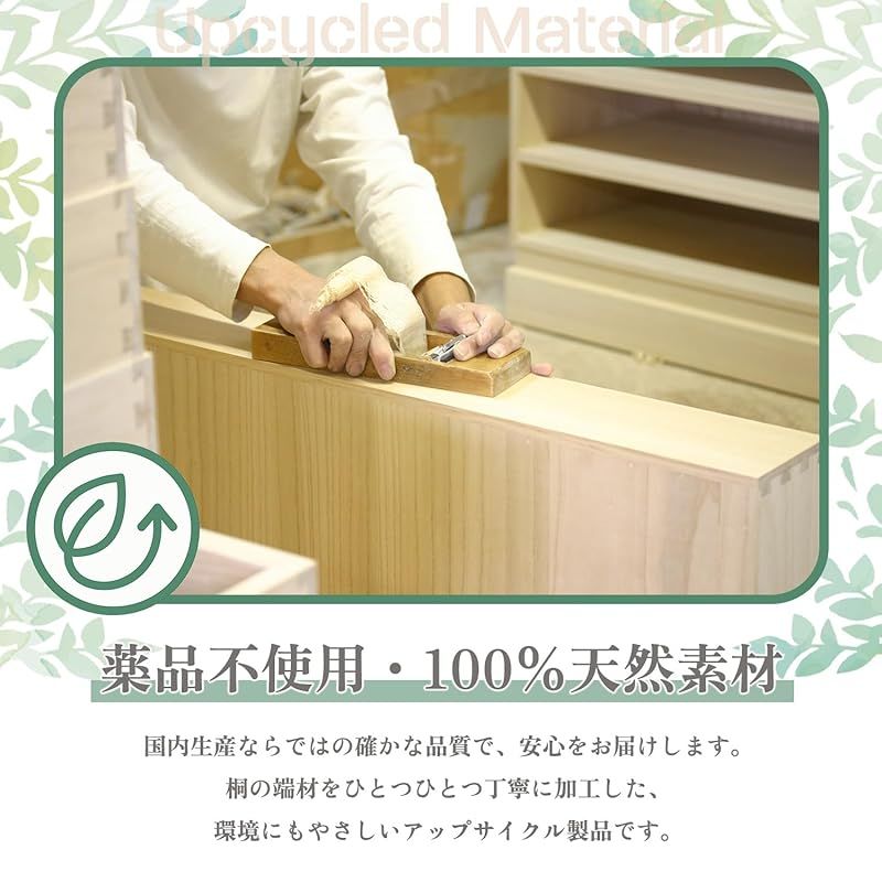 【桐の木で調湿して虫・カビ対策】:湿気を吸いやすく放出しやすい、調湿に優れた桐材で湿度を安定させ虫やカビが発生しにくい環境に。薬品を使わず天然の力で湿気をコントロールして、清潔な空間を維持。