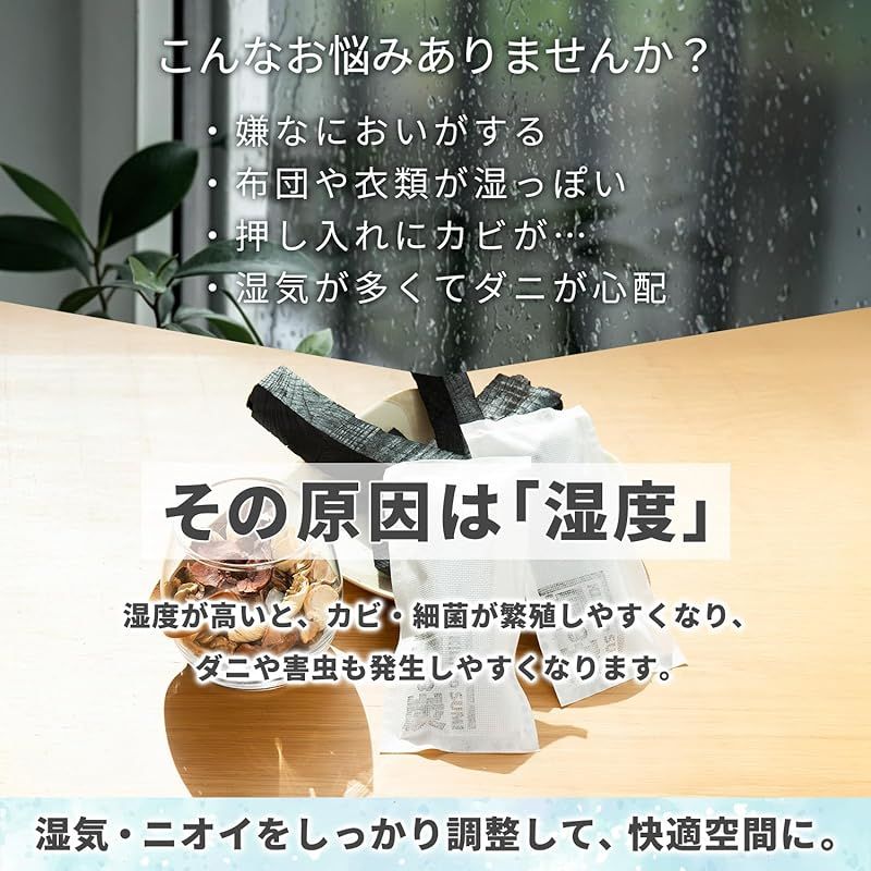 【どこでも置ける日本製の天然素材】:環境にも優しい国内生産の天然素材なので、場所を選ばず使いやすい。箪笥やクローゼットなど衣類収納や、冷蔵庫などのキッチン周り、洗面所やトイレまで、お家の中で湿気やにおいの気になる場所にどこでも置ける。小さめサイズの2個セットなので靴の吸湿・脱臭にも!