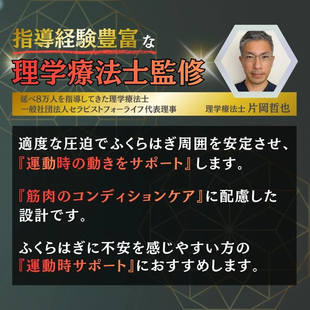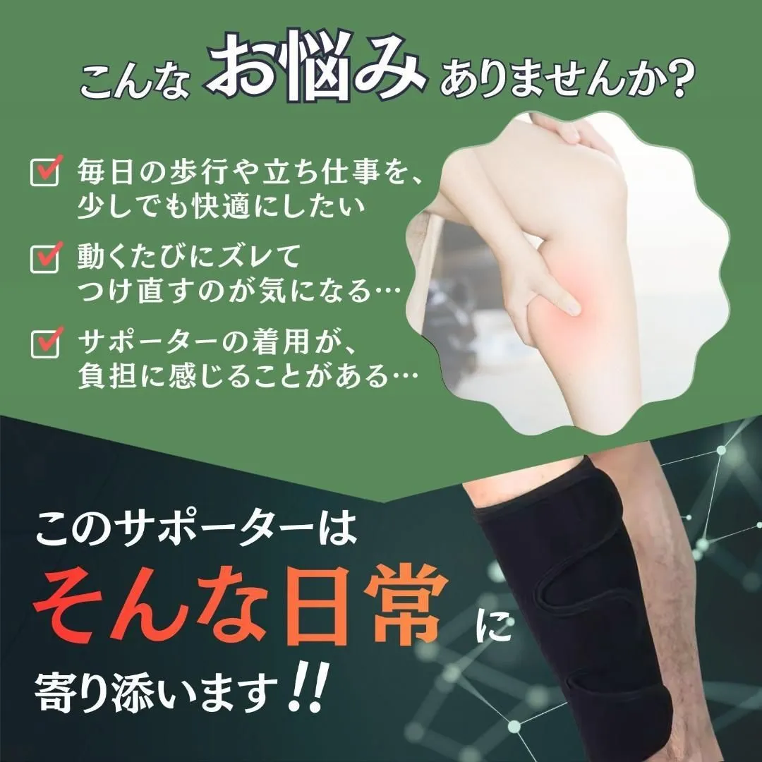 こちらは、ランニングや各種スポーツ、立ち仕事などによるふくらはぎの疲労や痛みをサポートするマジックテープ式サポーターです。