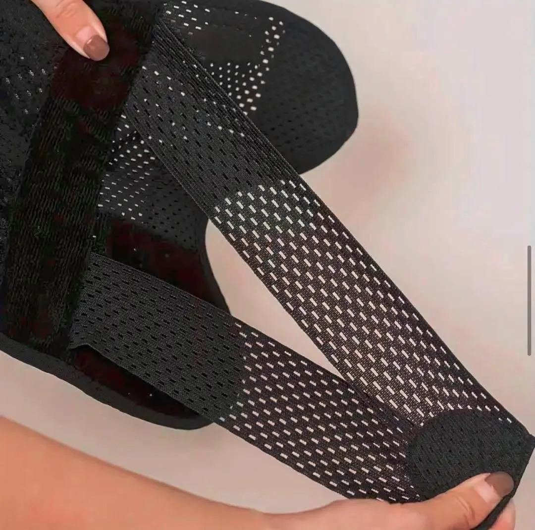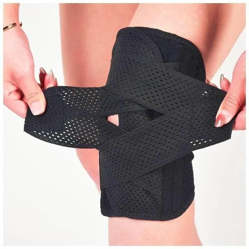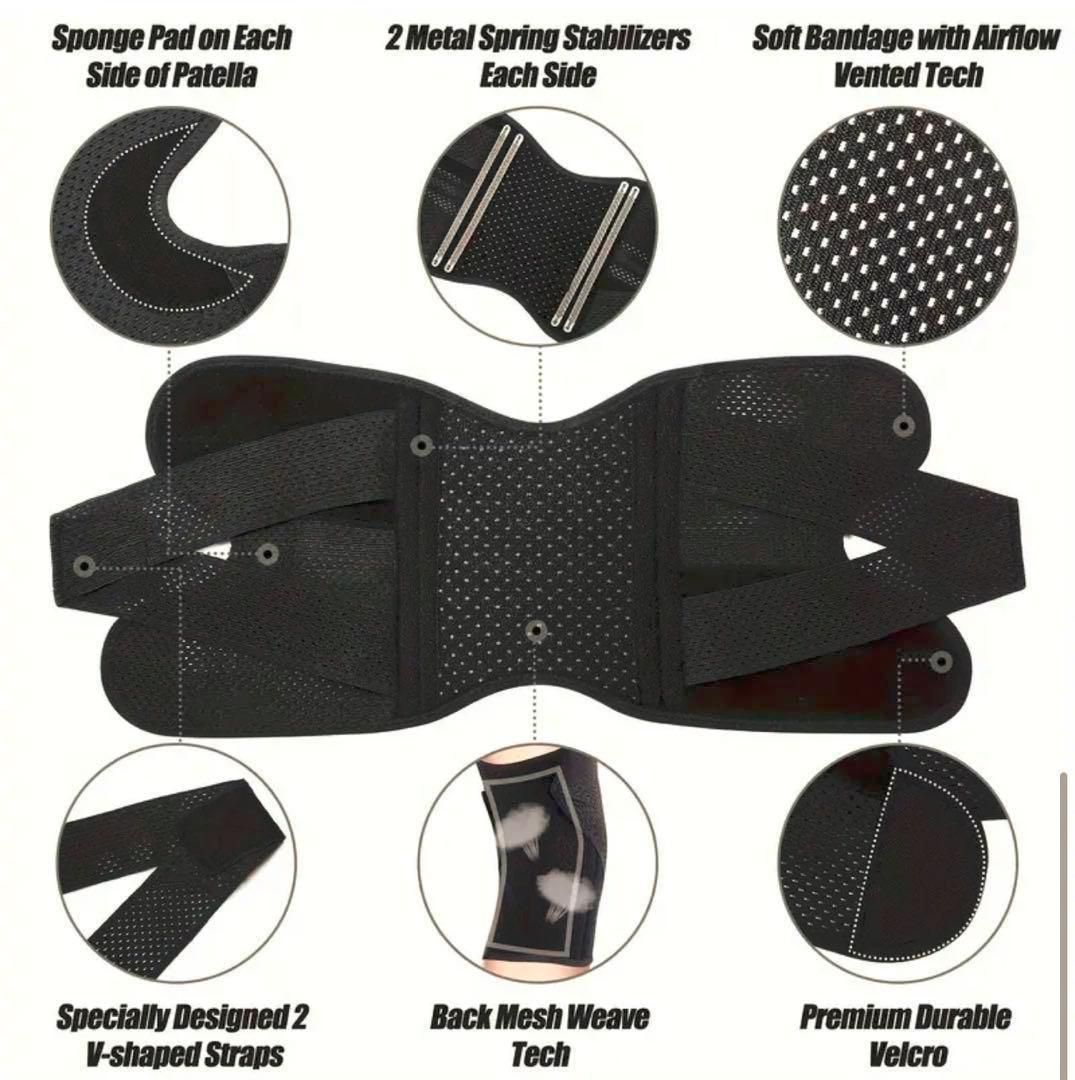 本製品は、これまでのサポーターとは一線を画す、独自の強化ストラップシステムを搭載しています。画像にあるX字状に交差するストラップが、膝関節の前後左右をしっかりと包み込み、不安定な動きを抑制。半月板への負担を軽減し、膝の安定性を飛躍的に高めます。これにより、歩行時や運動時の安心感が格段にアップします。
