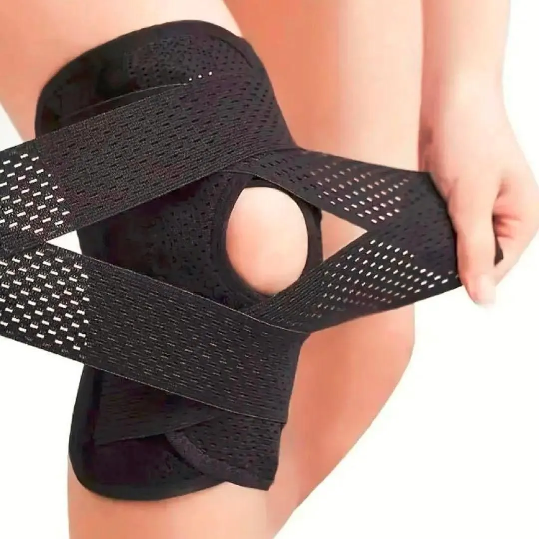 本製品は、これまでのサポーターとは一線を画す、独自の強化ストラップシステムを搭載しています。画像にあるX字状に交差するストラップが、膝関節の前後左右をしっかりと包み込み、不安定な動きを抑制。半月板への負担を軽減し、膝の安定性を飛躍的に高めます。これにより、歩行時や運動時の安心感が格段にアップします。