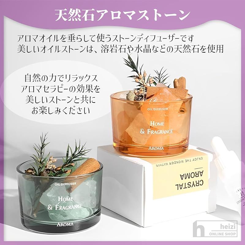 【天然石が香りを届けるアロマストーン】溶岩石や水晶など自然の力を活かしたディフューザー。電気や火を使わず安心してアロマを楽しめます。