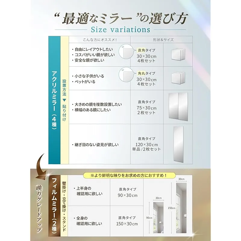 【使い方無限大】75cm×30cm2枚セット。縦に並べれば全身鏡に。一枚で髪型チェックなど配置次第で様々な使い方ができます。