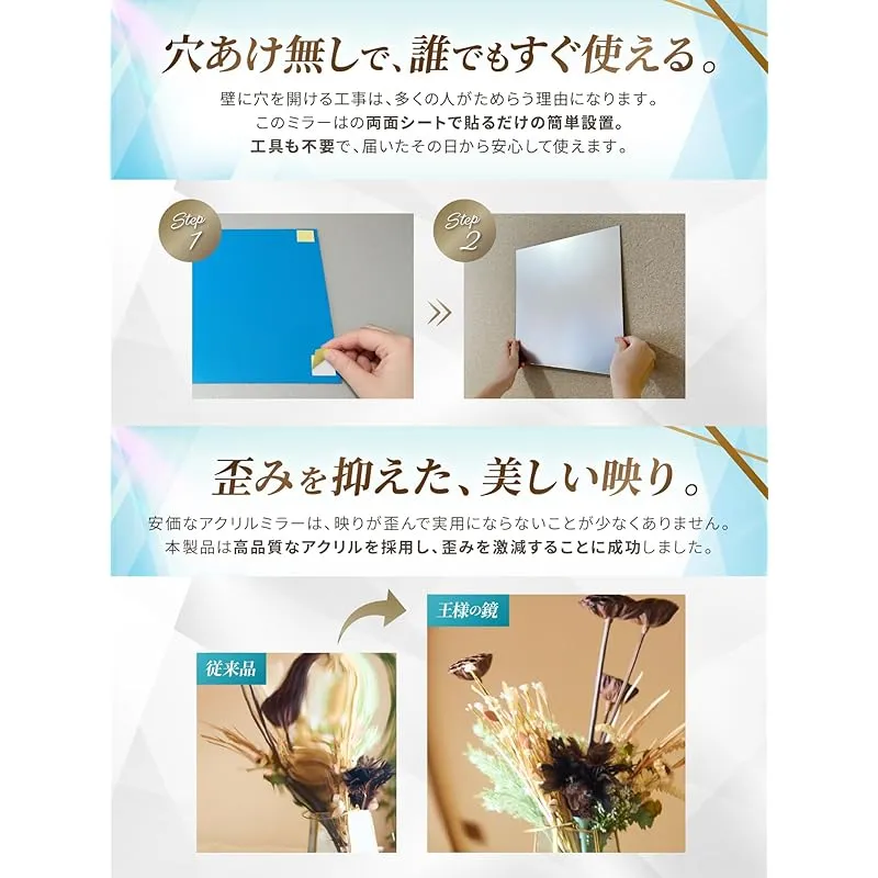 【歪み超軽減】これまでのアクリル製鏡は通常のガラス製鏡に比べると極端に歪みがひどい物が多かったです。当製品は歪み軽減に徹底的にこだわり、近距離ではガラス製に近い感覚で使用可能です。