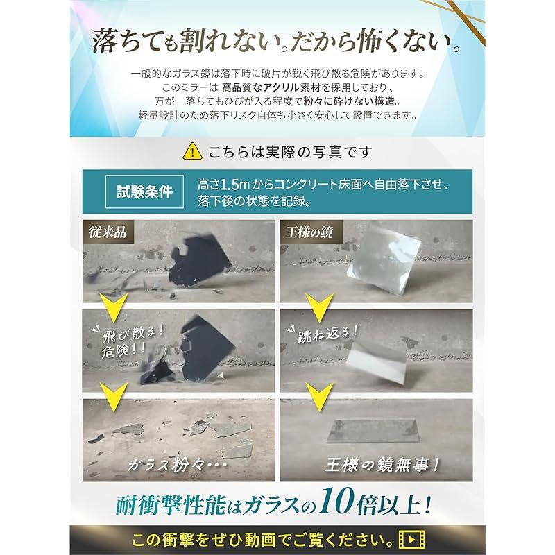 【アクリルミラーで怪我ゼロへ】飛散防止、軽量設計の為、万が一落下しても鏡に比べ怪我のリスクが低下します。地震など災害時にも割れる心配が無く、小さなお子様やペットの安全対策としてもオススメです。