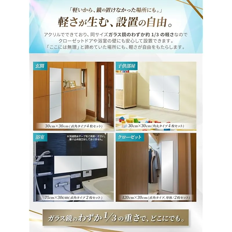 【軽量で割れない鏡】アクリル製で割れない。飛散防止ミラーです。2mm厚でしっかりしているのに一枚当たり約170gと非常に軽量です。