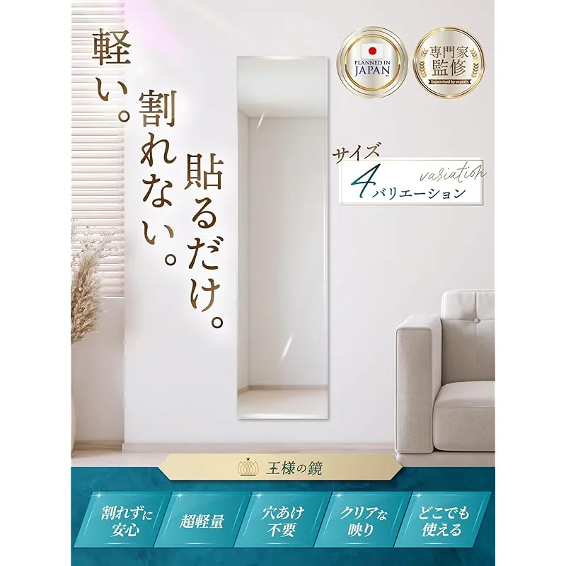 【諦めてませんか?】部屋が狭く、全身鏡を置くスペースが無い…そんな悩みを解決したい一心でBOOMIE「どこでも貼れる割れない鏡」は誕生しました。壁さえあればどこでも設置可能。出かける前に全身をサッとチェックできます。