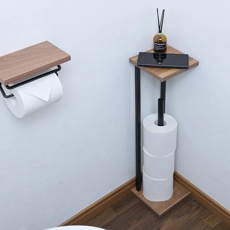 【おしゃれなトイレ収納】マットな質感のフレームとあたたかみを感じる木目調の天板の組み合わせで、見た目にもおしゃれにトイレットペーパーを収納できます。