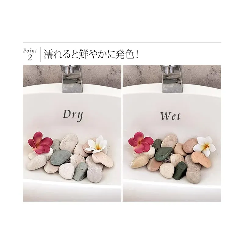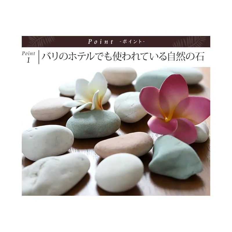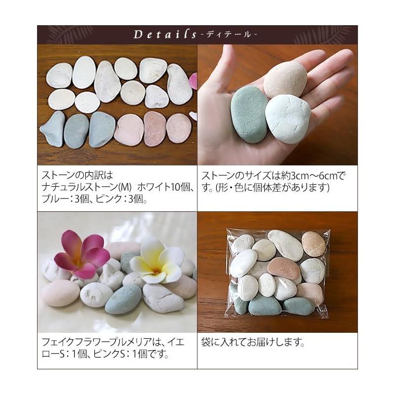 南国コーデの名脇役のストーン(ホワイト、ブルー、ピンク)に、本物みたいと人気の南国のお花プルメリアの造花のセットで、届いたらすぐに写真のように飾っていただけます。 南国バリ島の素敵なホテルでも、装飾やインテリアとして使われている自然の石です。自然ならではの一つ一つ異なる表情が味わいをプラスし、石の風合いが爽やかさも演出。これを飾るだけでリゾート気分を味わえます。