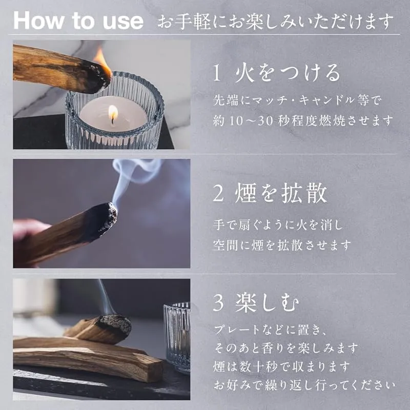 【ご注意】火を付けて使用する場合、スティックに火がついたら手などで仰いで火を消してください。すると白い煙が立ち上り、香りが部屋に立ち込めます。この時、火を消さないと黒い煙が出てしまいます。また火を消した後は、お香のように自然に燃え進むことはなく、10-20秒で自然鎮火します。