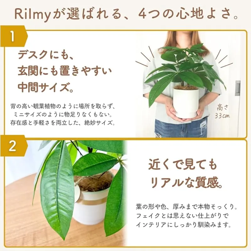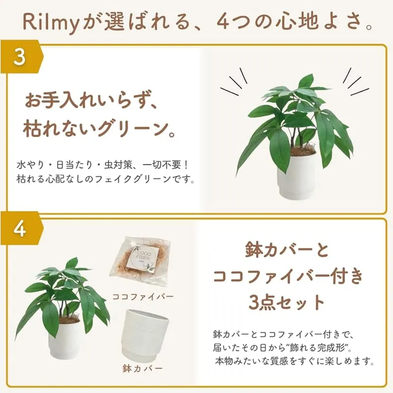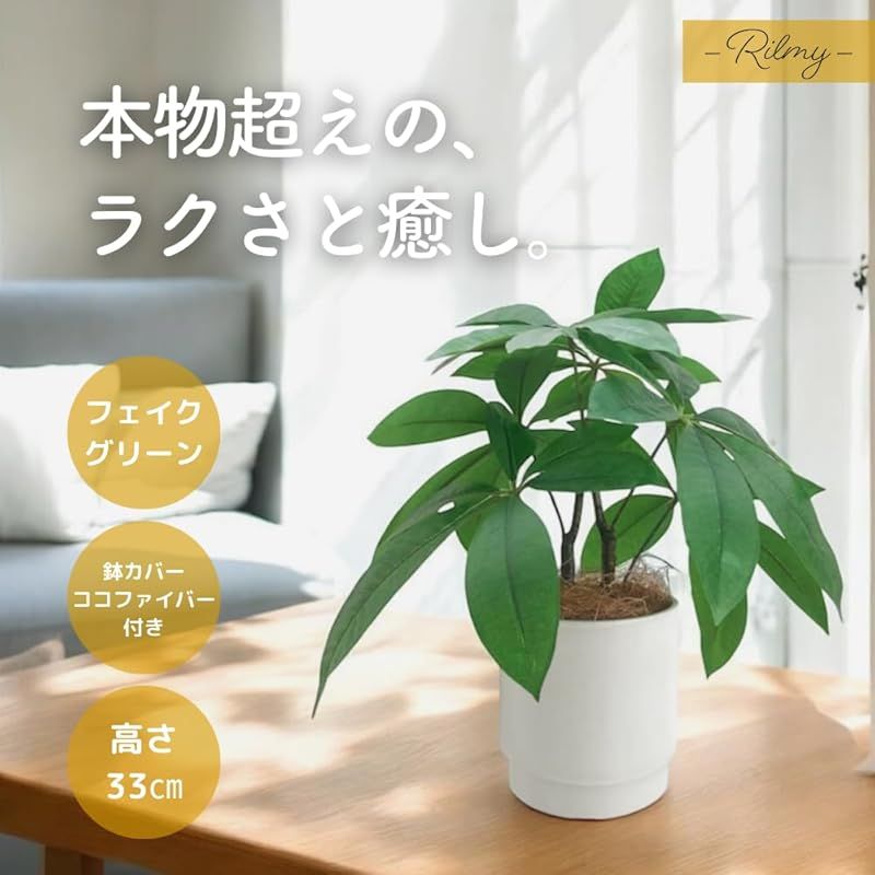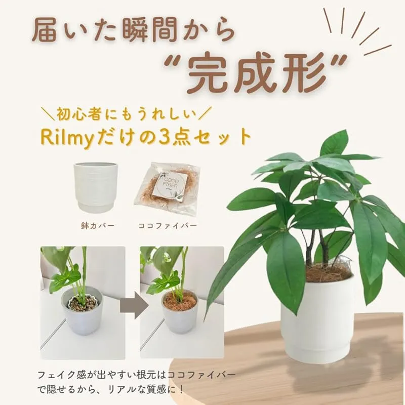 商品名:Rilmy(リルミー) フェイクグリーン 卓上 観葉植物 パキラ 造花 人工観葉植物 インテリア オシャレ インテリアグリーン ミニ フェイク 高さ33 鉢カバー付き ココファイバー付 3点セット (パキラ)