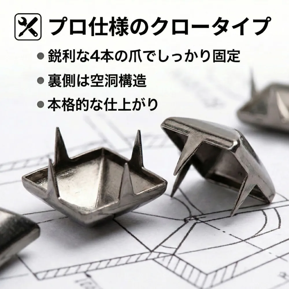 ・4本爪でしっかり固定:布・革に爪を通して裏側で曲げるだけ
