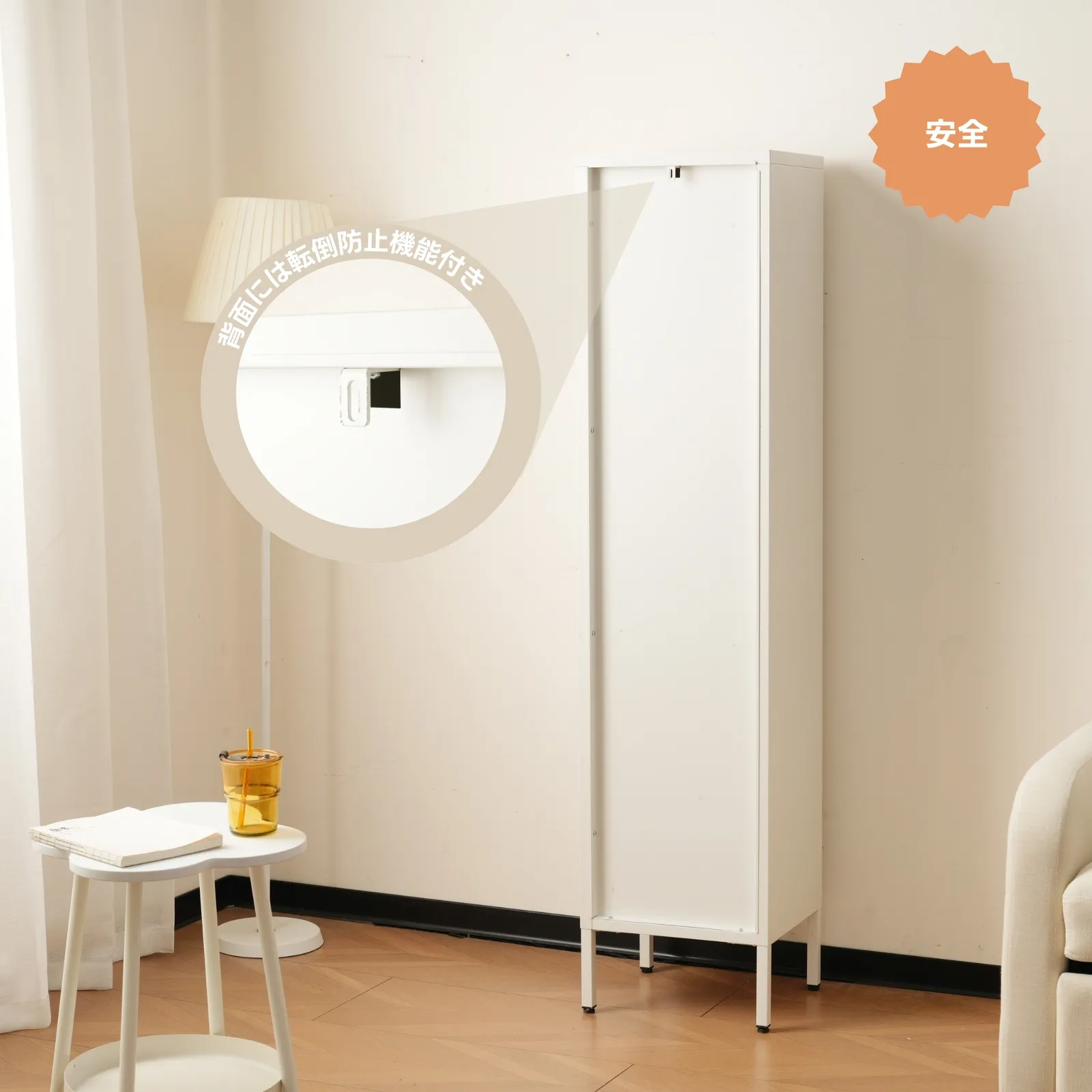 ・扉の中は高さが自由に調節できる可動棚で効率よくたっぷり収納できます。棚板を支えるのは金属ネジダボなので抜け落ちる心配がなく頑丈です。