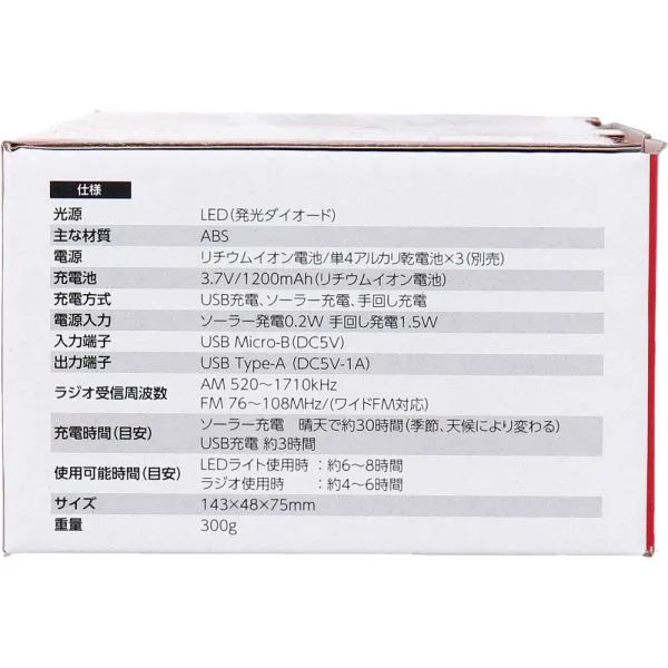 ・使用可能時間(目安):LEDライト使用時 約6~8時間、ラジオ使用時 約4~6時間