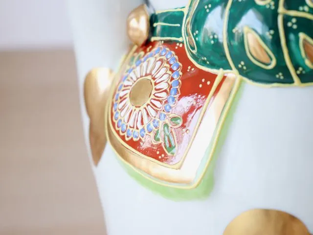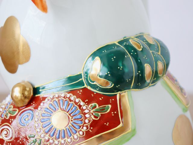 九谷焼にも様々な技法がある中で、この招き猫には「盛(もり)」技法を使用。イッチン(金具)で絵の具を立体的に盛り上げ、熟練の職人が一点一点丁寧に仕上げています。極彩色や金彩が美しく、オリエンタルな雰囲気が人気です。