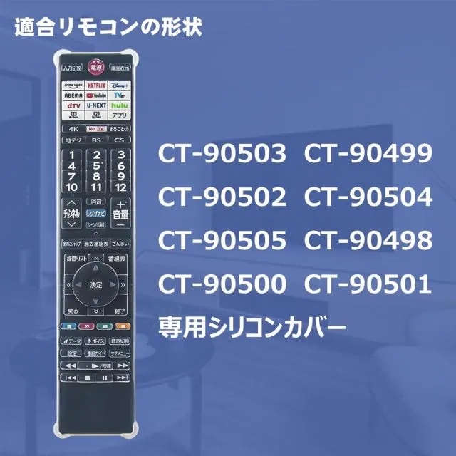 ・CT-90503CT-90499CT-90502CT-90504CT-90505CT-90498CT-90500CT-90501専用シリコンカバー・ボタン位置に合わせてシリコンカバーを凹凸に型取りしていますのでボタンの表記が見やすくリモコン操作が簡単です。