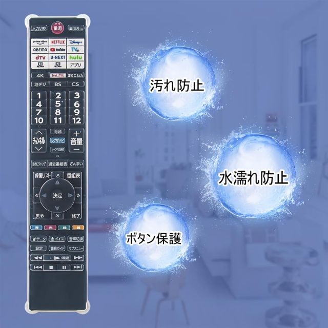 ・汚れや埃から守るシリコンカバー:お水が入ったコップを倒したとき、水の侵入も防ぎます。(防水機能はございません。)・リモコンカバーをリモコンに装着する手順リモコン・リモコンカバーともに裏面にして下方から挿入するカバーの頭をひっぱり、リモコン本体を被せるようにする装着完了後、リモコンカバーの正面の凹凸は、リモコンボタンの凹凸にピッタリさせることをご確保ください。・シリコンの性質上入れにくいことがあります。ゆっくりと少しずつ、上下左右に伸ばしながら装着してください。ボタン位置のずれがある場合も同様に上下左右伸ばして調整ください。・無理な力が掛かると破れる場合がございますのでご注意ください。