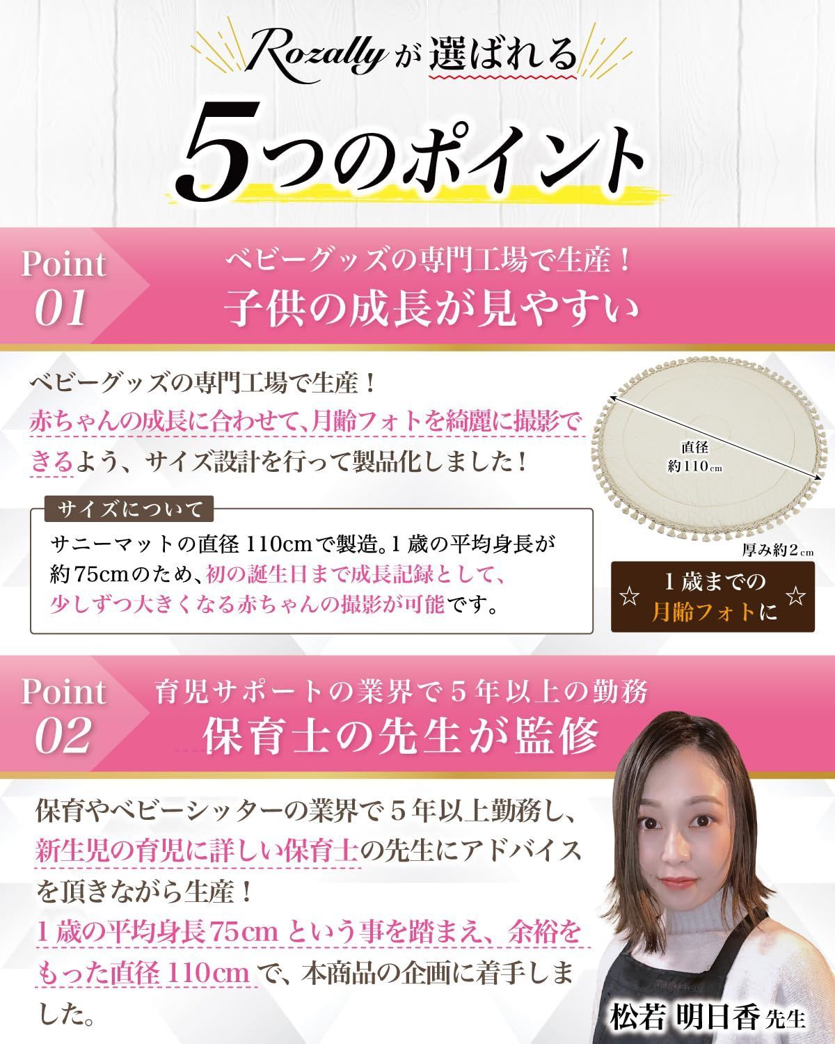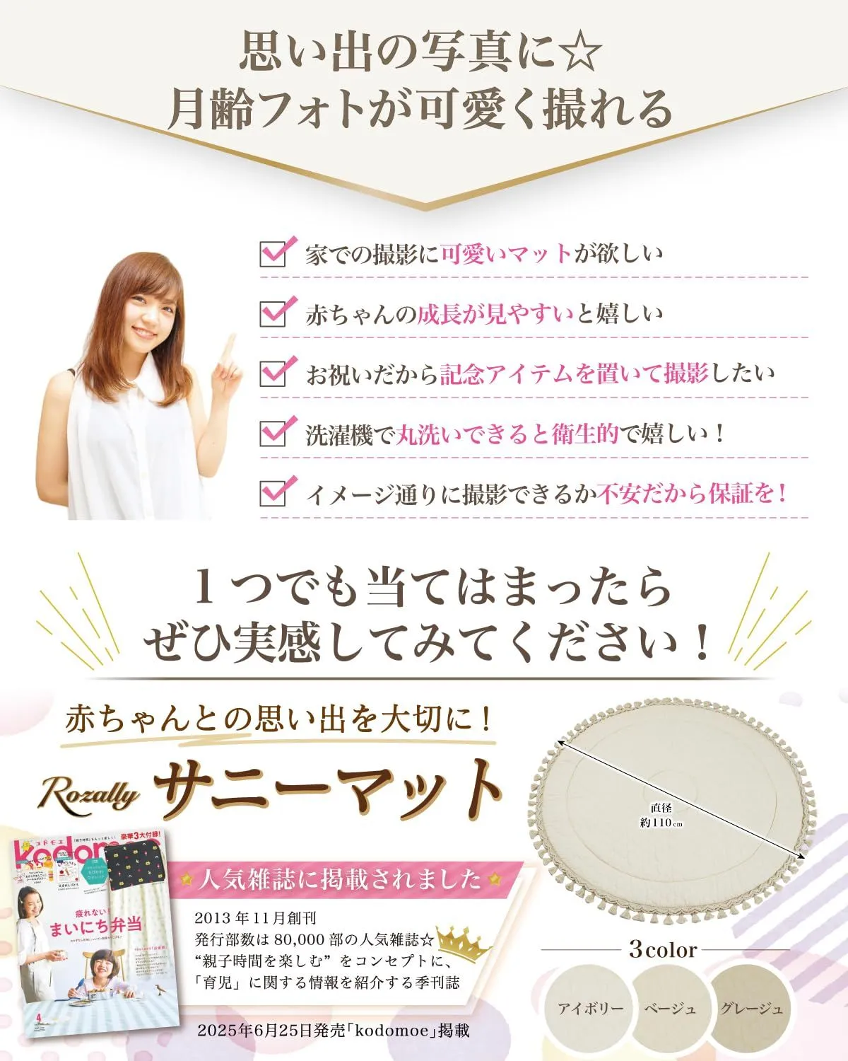 「月齢フォトの映える背景に…」「ベビーマットとしてお昼寝に使いたい…」という お客様の声から生まれた 「記念撮影で大活躍」 の 洗える サニーマットです。 リビングに敷いて お昼寝マット や プレイマットとして使用できるのも人気の1つです。 「お七夜」「お宮参り」「初節句」「百日祝い」「お食い初め」「初誕生日」などの、 赤ちゃんの成長記録として記念写真に大人気のイブルマットとなっています。 「ごろ寝」している可愛い寝相を今話題のごろ寝アートとして、 記念写真に残しておくのも大切な思い出になります。