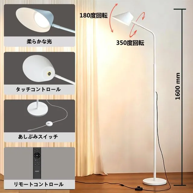 【広範囲を照らせる間接照明スタンド】このフロアライトの最上は柔軟なネックアームで350°回転可能、ヘッドは180°回転可能により、光の方向を自由自在に調整し、リビングルームの間接照明として、ベッドサイドのスタンドライトとして、またデスクライトとしてもお使いいただけます。