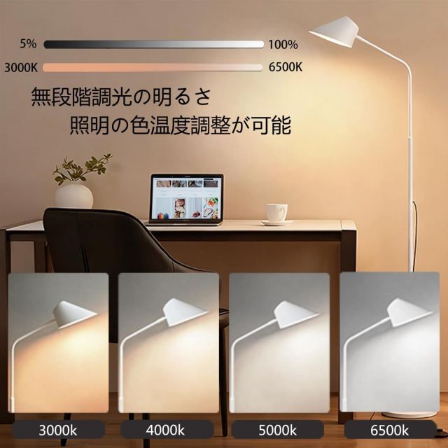 【12W高輝度LED&無段階調光・調色】このスタンドライトは、12の高輝度LEDを搭載し、明るく快適な空間を演出します。2700K-6500K色温度と10%-100%の明るさが調節可能で、お部屋の雰囲気や用途に合わせて、明るさと色温度を自由に調整できます。