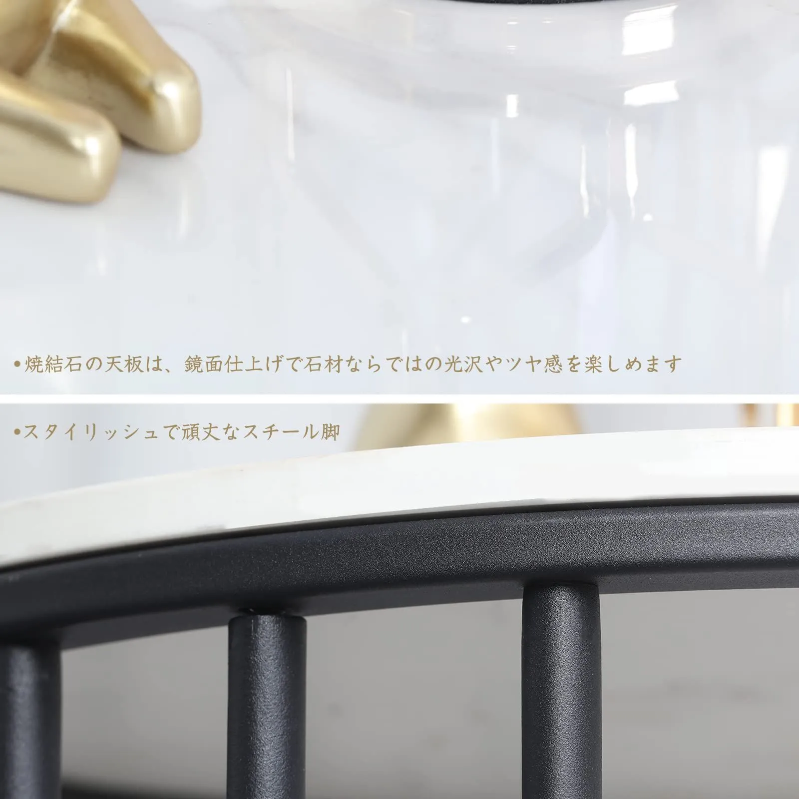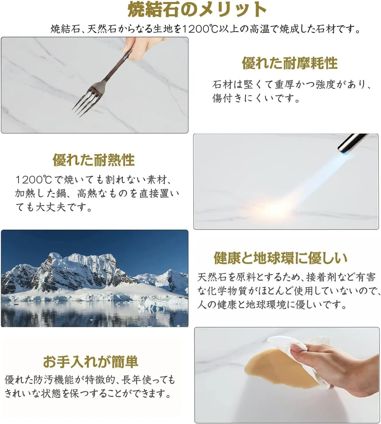 焼結石の魅力:天板には、重厚感と高級感溢れる焼結石を使用、天然石のリアルな質感を再現します。焼結石は水分、傷に強く、優れた防汚機能が特徴、高温耐性もあるので、長く使っていただいてもきれいな状態を保つすることができます。