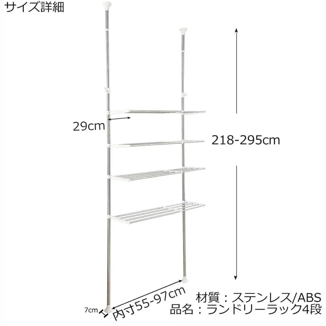 使用サイズ(約):幅55-97X奥行29X高さ218-295cm、自宅の洗濯スペースに合わせ棚を無段階調節できる、つっぱり洗濯機ラック。