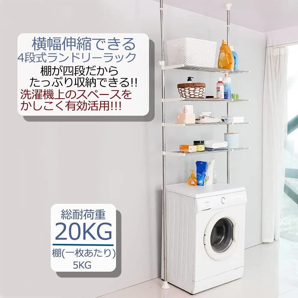 BAOYOUNI つっぱり棚 洗濯機ランドリーラック4段 突っ張り式 収納 横幅伸縮式 ステンレス 段差があっても設置できる 耐荷重20kg 簡単 省スペース (ホワイト)