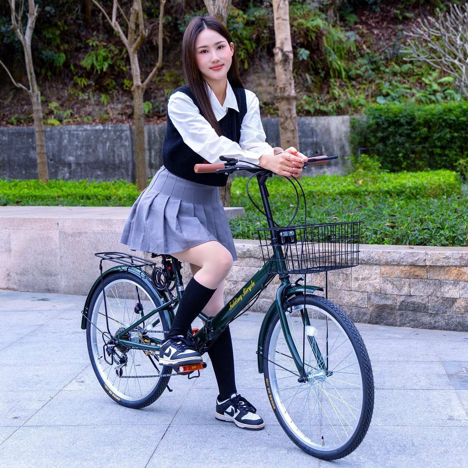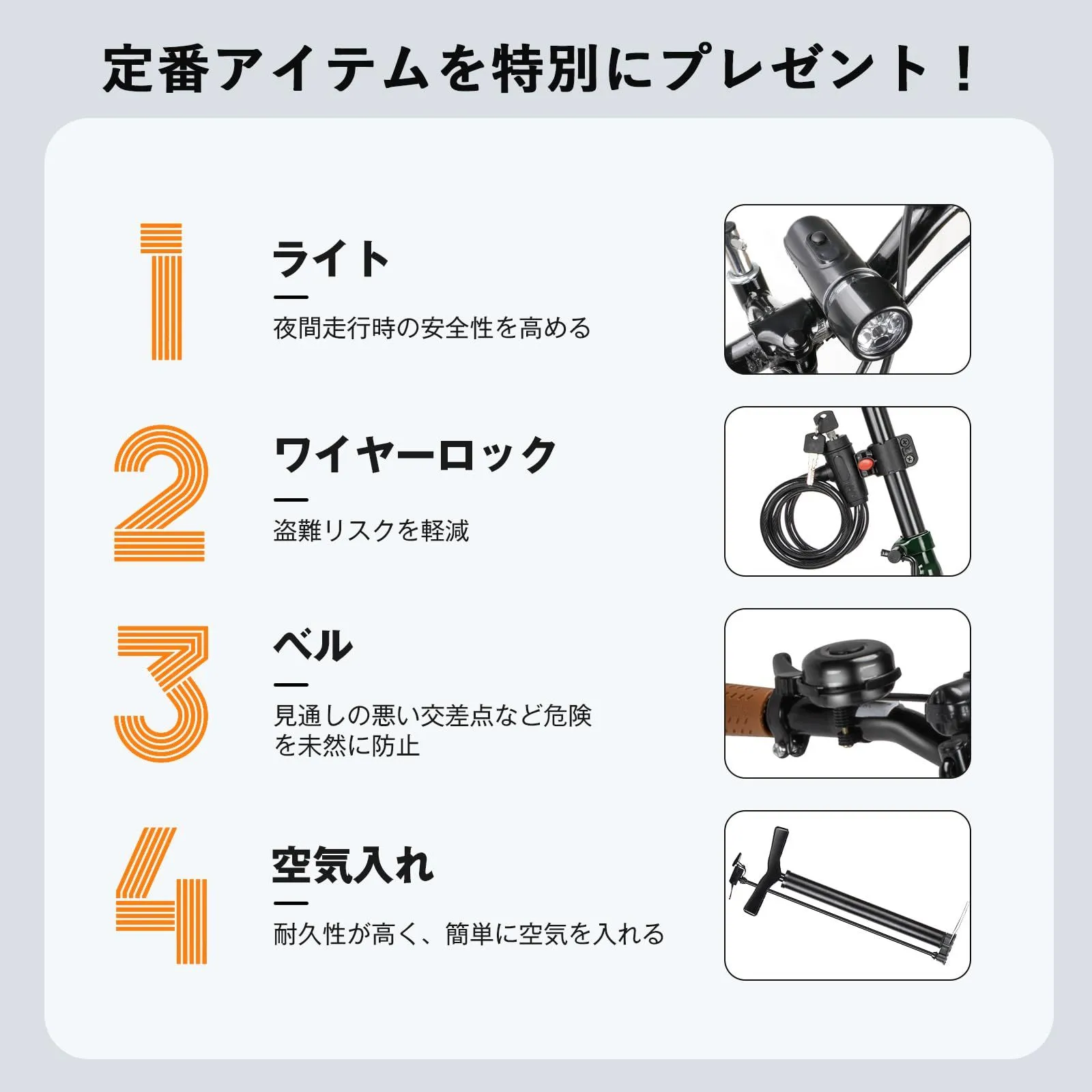 【快適な走行体験】折りたたみ自転車は高さ調節可能なハンドルとサドルを搭載し、身長に合わせて簡単に調整できます。人間工学に基づいた厚めのサドルは、路面の振動を効果的に吸収し、長時間のライディングに伴う痛みを軽減します。さらに、リアキャリア、カゴ、ライト、ワイヤーロック、ベル、空気入れなど必要なアクセサリーがすべて揃えており、別途購入は不要で、組立後すぐに快適な走行をお楽しみいただけます。