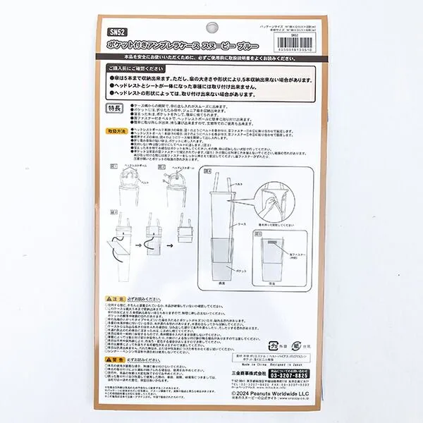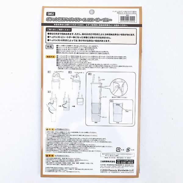 スヌーピーのアンブレラケースです。ヘッドレストに簡単に取り付けられて便利♪ポケットを外して水捨てもラクラク♪可愛くオシャレに傘を収納できちゃいます☆ポケット付きなので折り畳み傘なども収納可能です♪ぜひ車をスヌーピーで可愛くしちゃいましょう♪♪※傘の大きさや形状によりますが、5本まで収納できます!