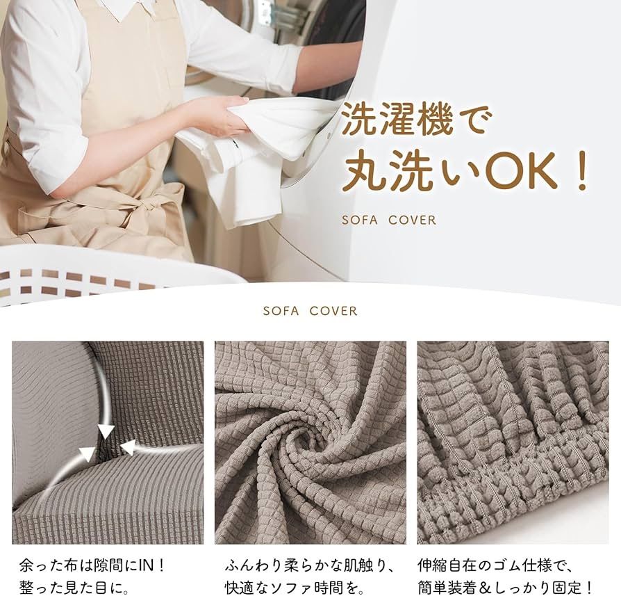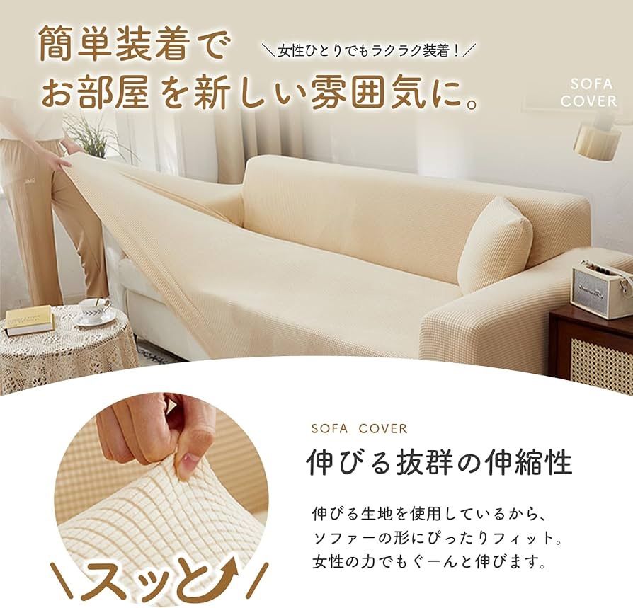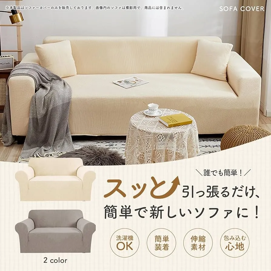 【ソファーを全面保護】 汚れ、傷、汗やほこりからソファーをしっかり守ります。ペットの引っ掻きや子どもの食べこぼし対策にも最適です。特に米色は汚れが目立ちにくい暖色系、浅灰色はほこりが見えにくい冷色系として機能的です。ソファーを守りながら、部屋を明るく清潔に見せる効果もあります。