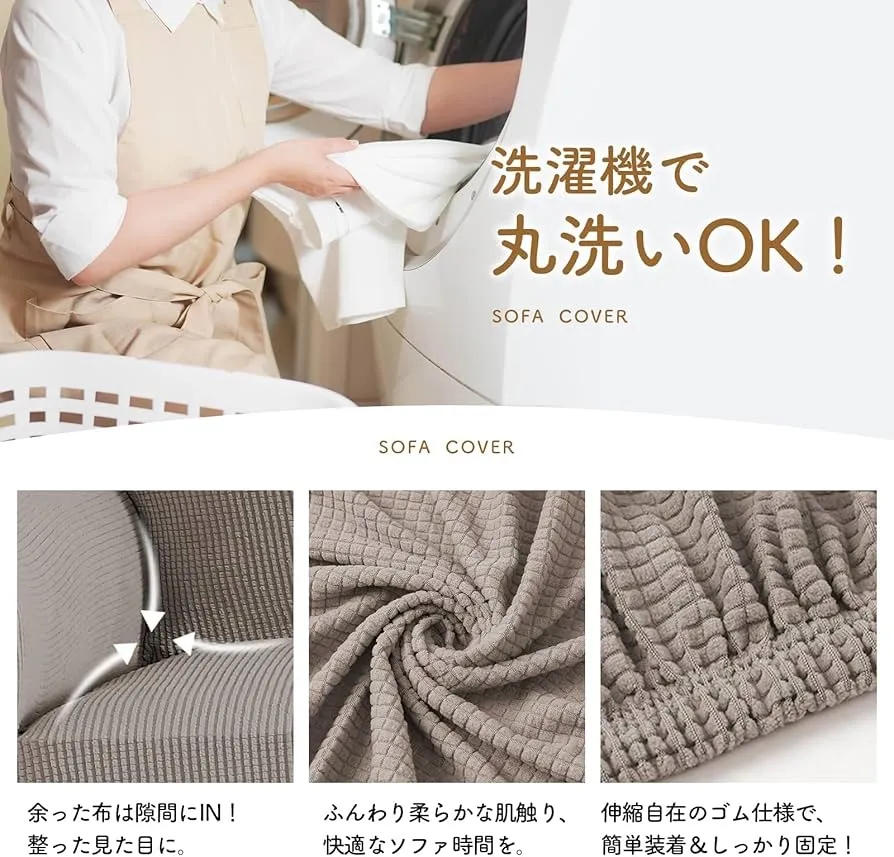 【高品質素材で優れたフィット感】 95%ポリエステル+5%スパンデックスの高品質な生地を使用。柔らかく快適な肌触りで、抜群の伸縮性を実現しています。選べるカラーは米色と浅灰色の2色。米色は温かみのある落ち着いた雰囲気を演出し、浅灰色は北欧風のシンプルで洗練された印象を与えます。どちらもお部屋に溶け込みやすく、インテリアを一段とおしゃれに。