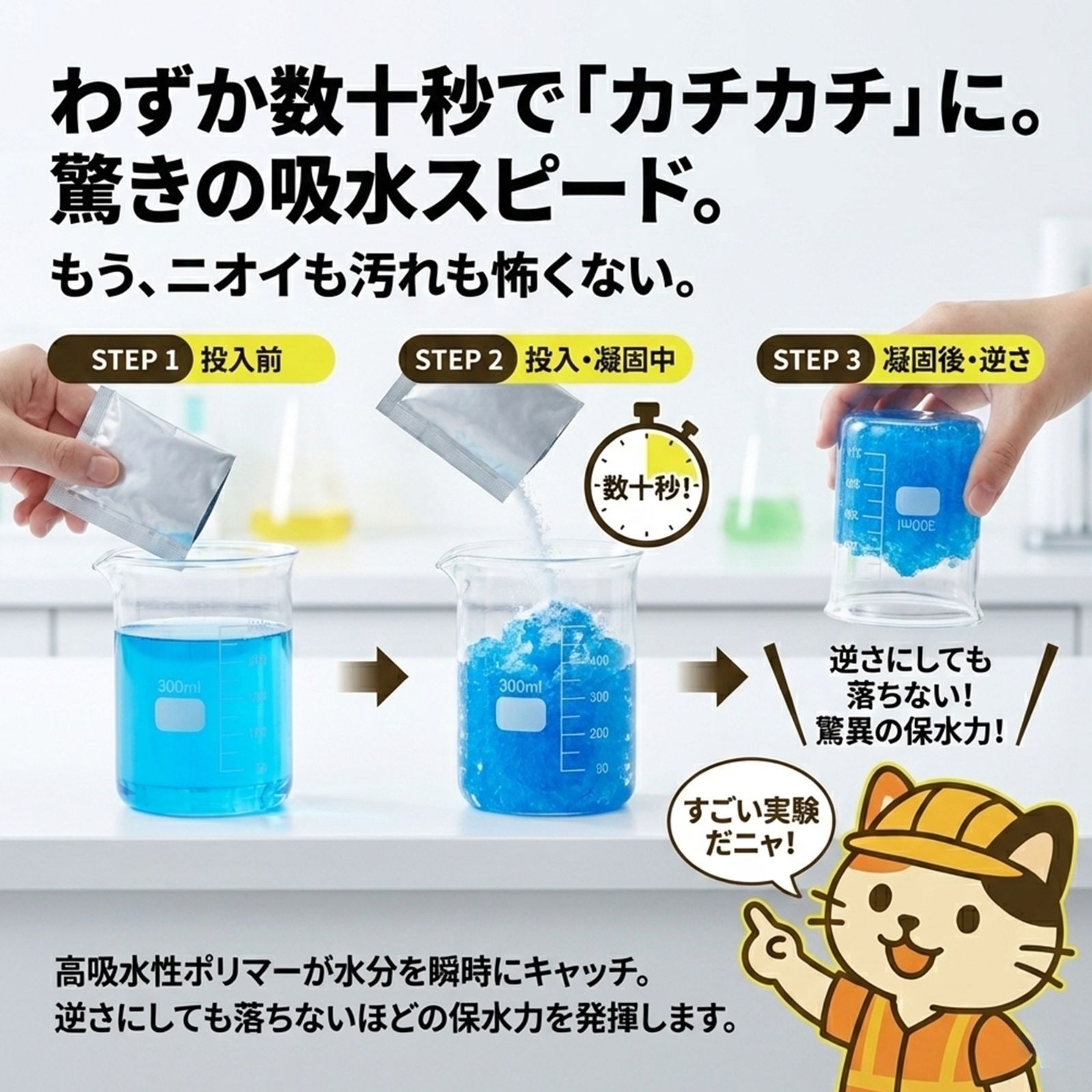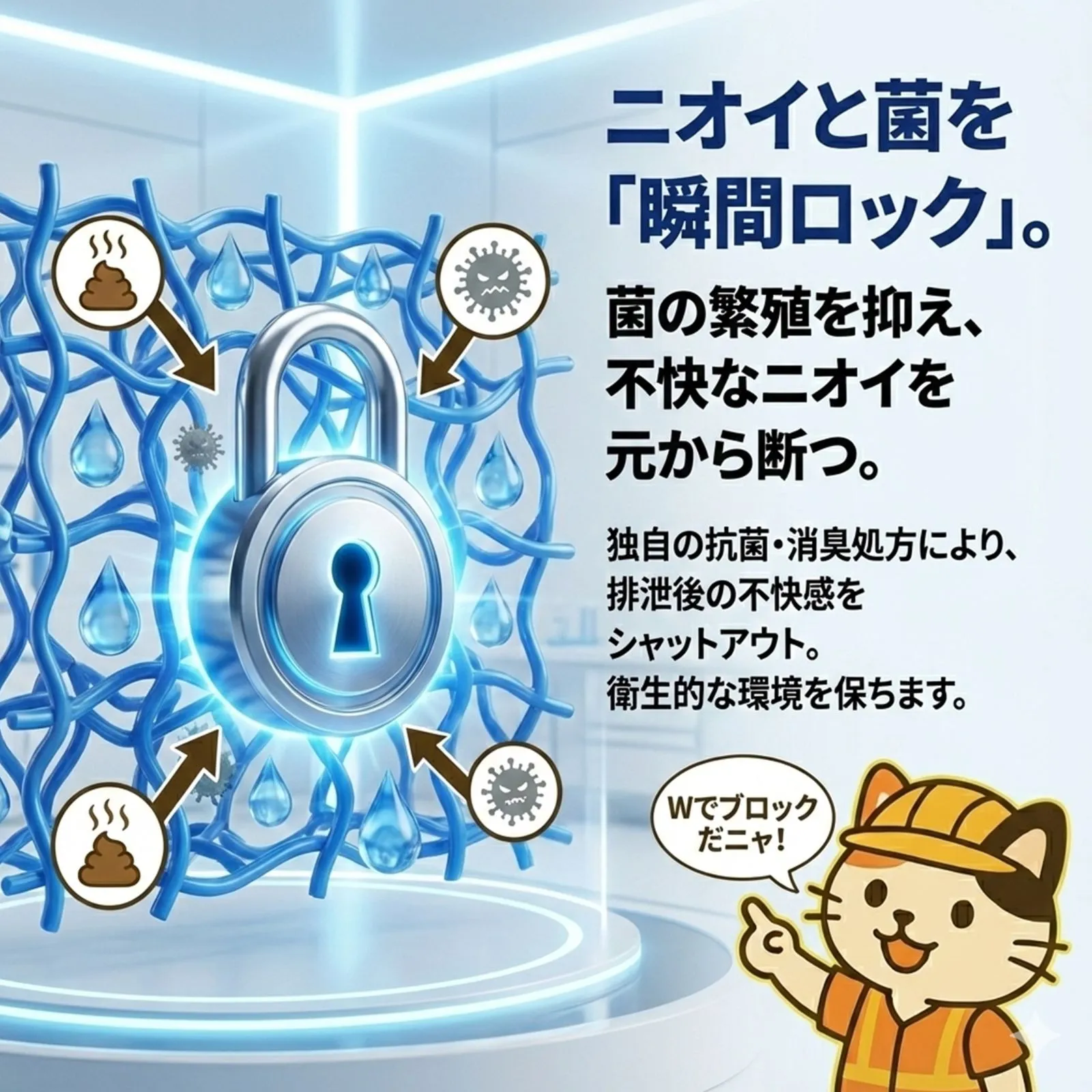 高吸水性ポリマーが水分を瞬時にキャッチ。逆さにしても落ちないほどの保水力を発揮します。さらに独自の処方で、ニオイと菌を「瞬間ロック」。菌の繁殖を抑え、不快なニオイを元から断ち切ります。