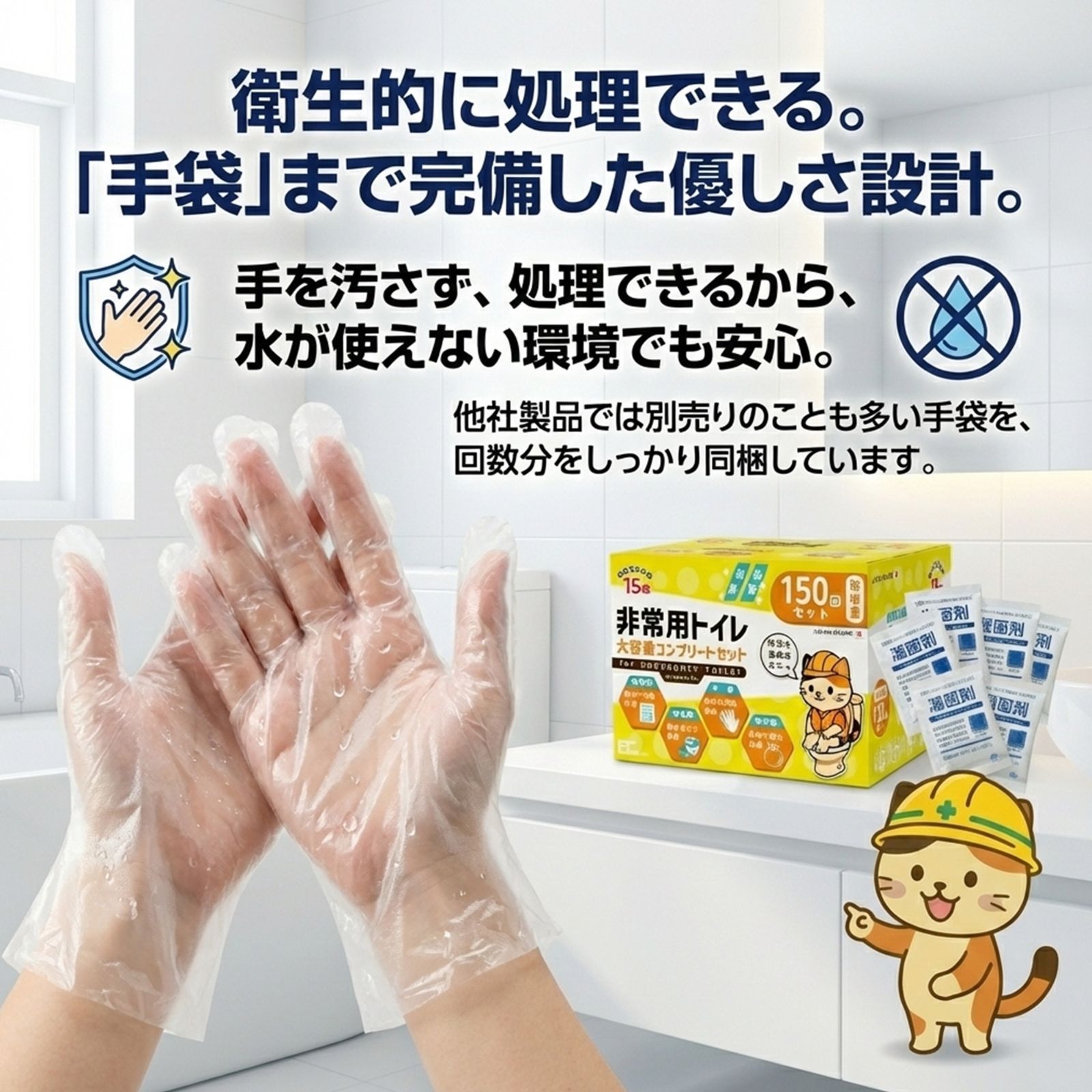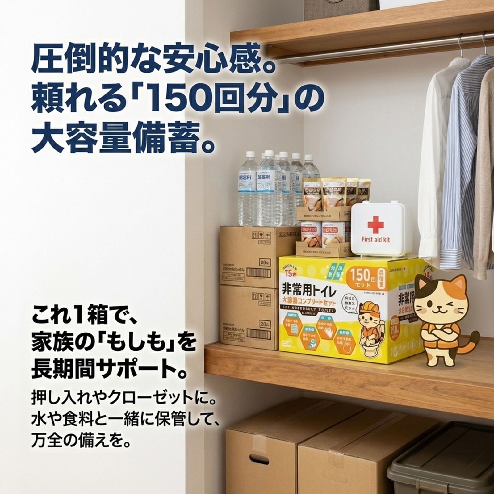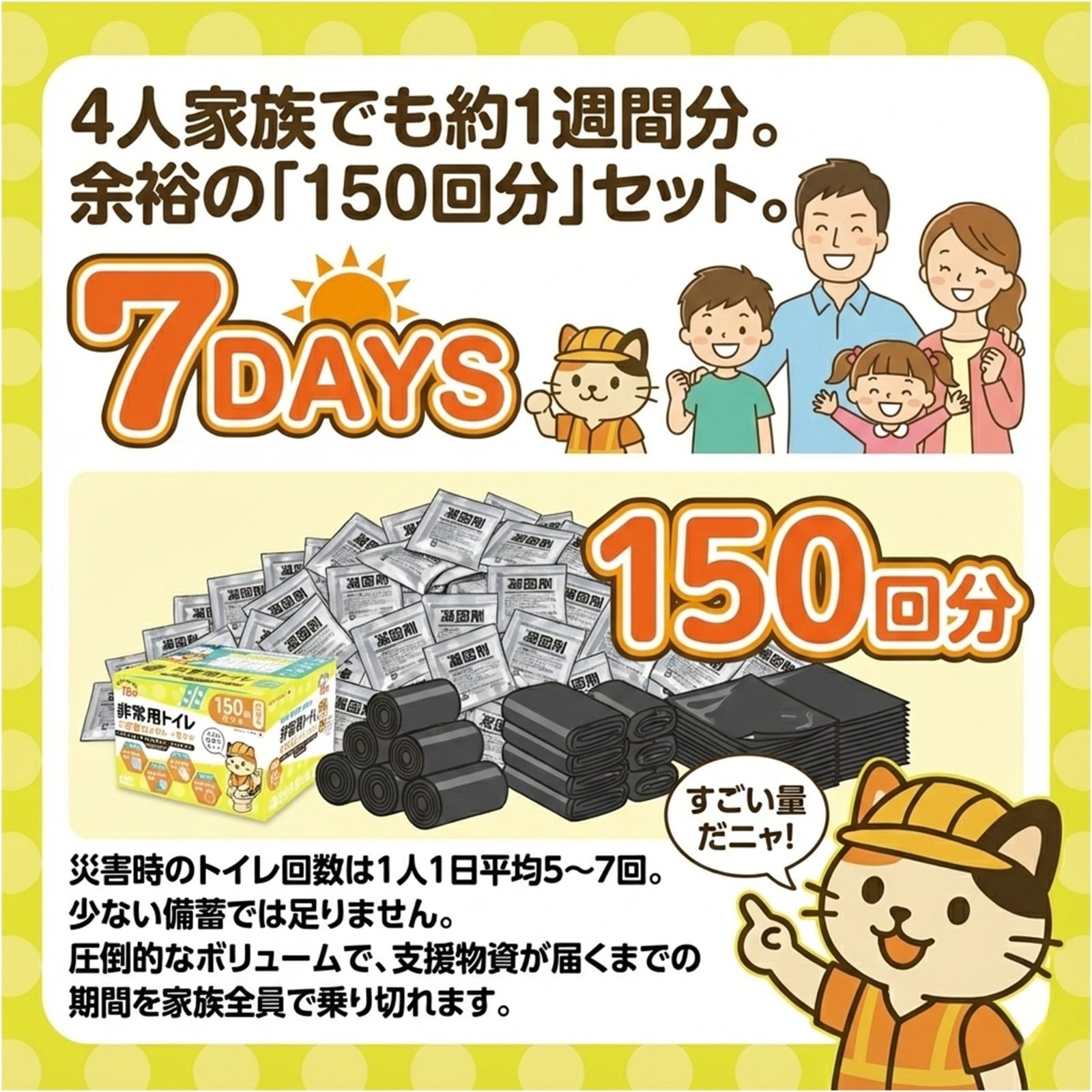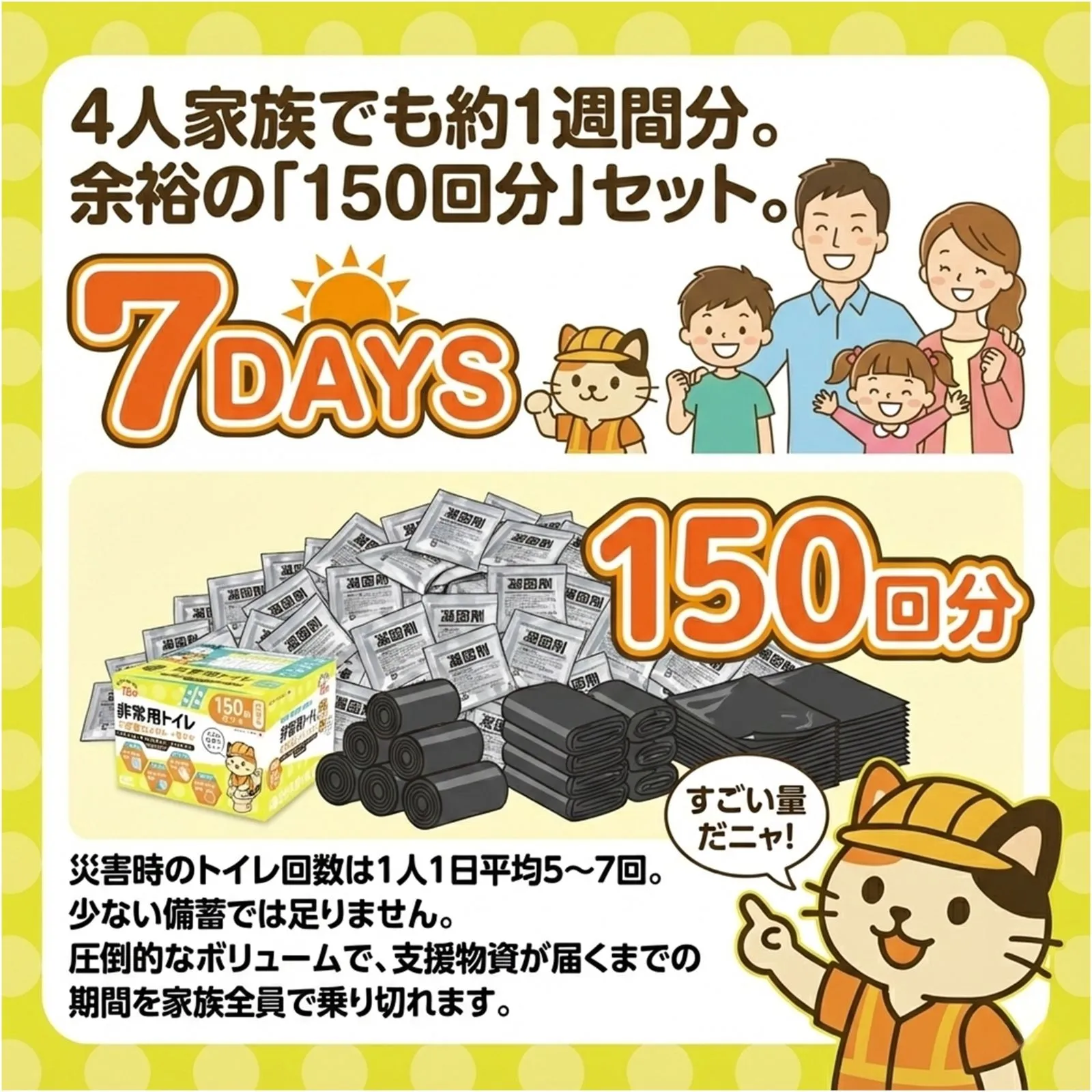災害時のトイレ回数は1人1日平均5~7回。少ない備蓄ではすぐに底をついてしまいます。150回分の大容量なら、支援物資が届くまでの期間を家族全員でしっかり乗り切れます。