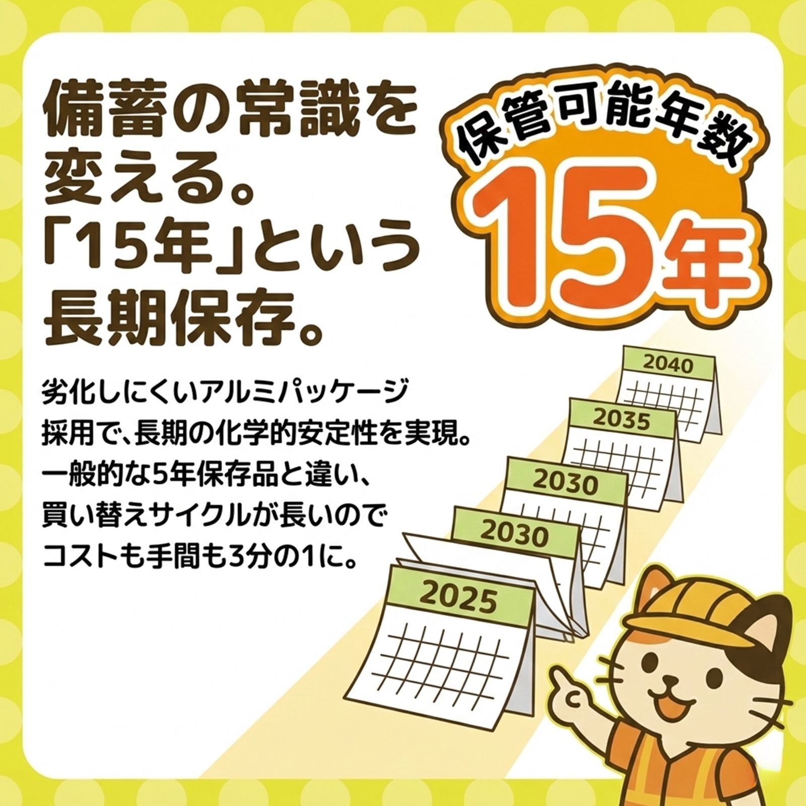 劣化しにくいアルミパッケージを採用し、長期の化学的安定性を実現。一般的な5年保存品と比べて買い替えサイクルが長いため、コストも手間もなんと「3分の1」に抑えられます。