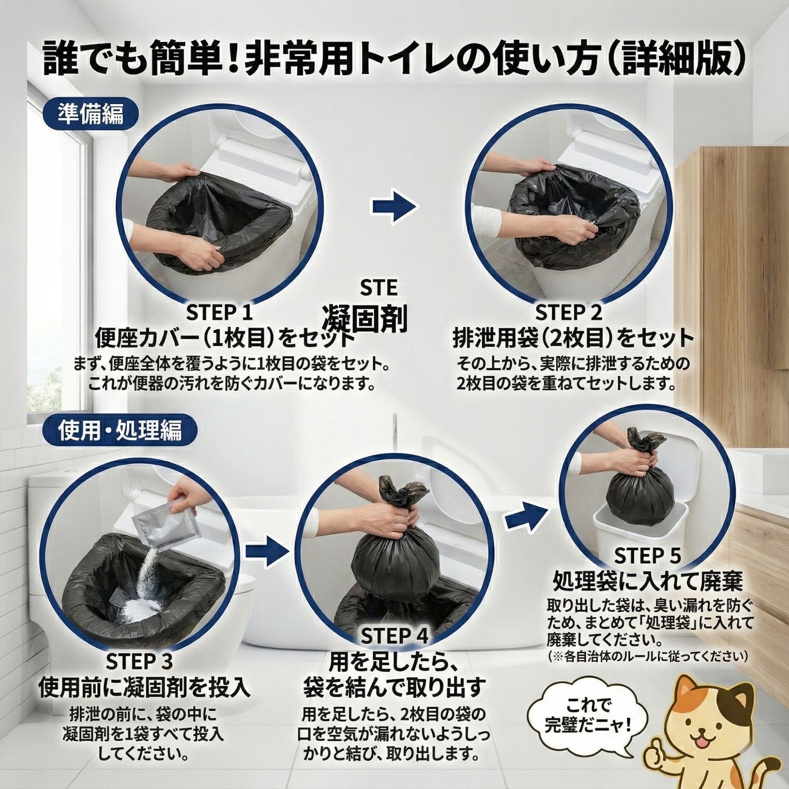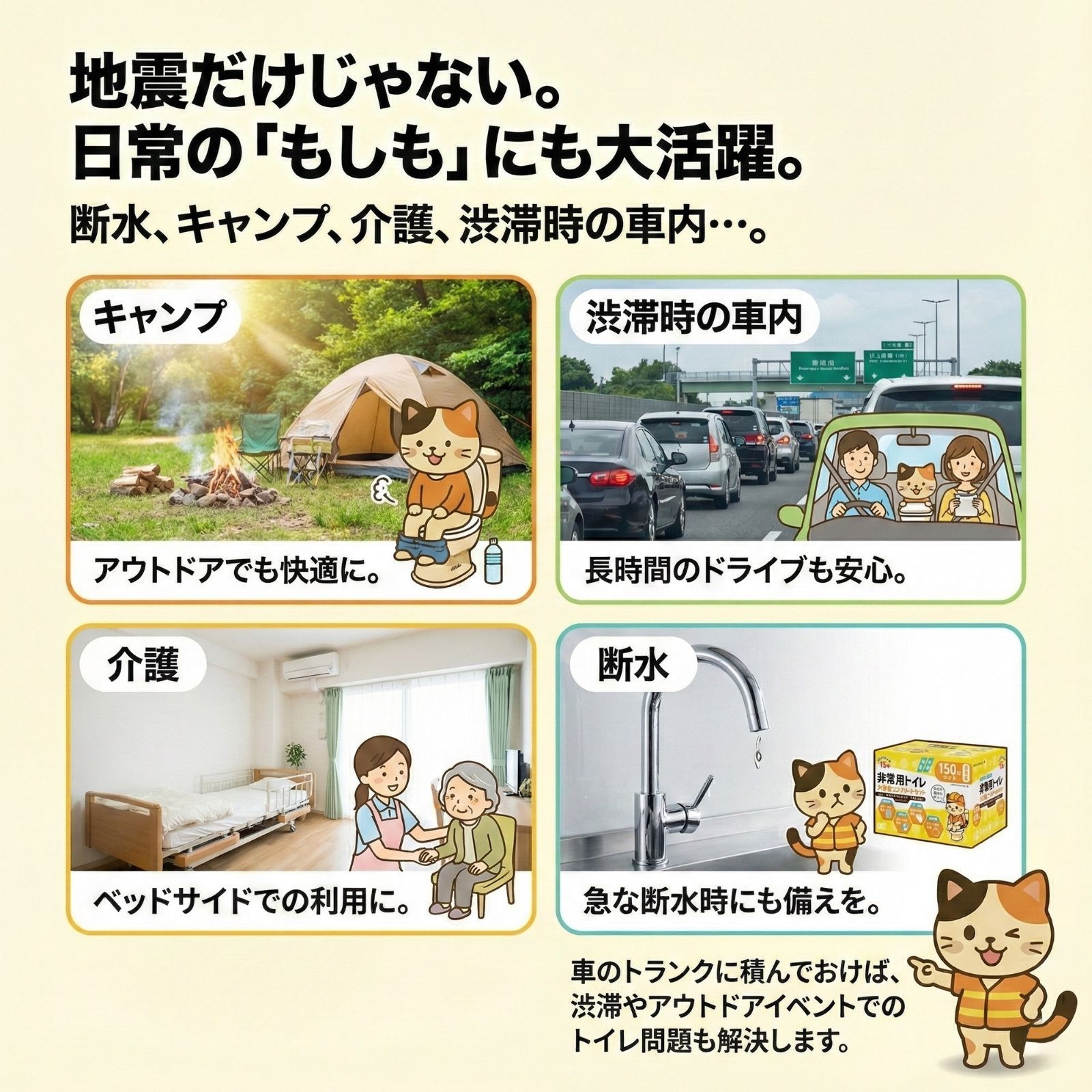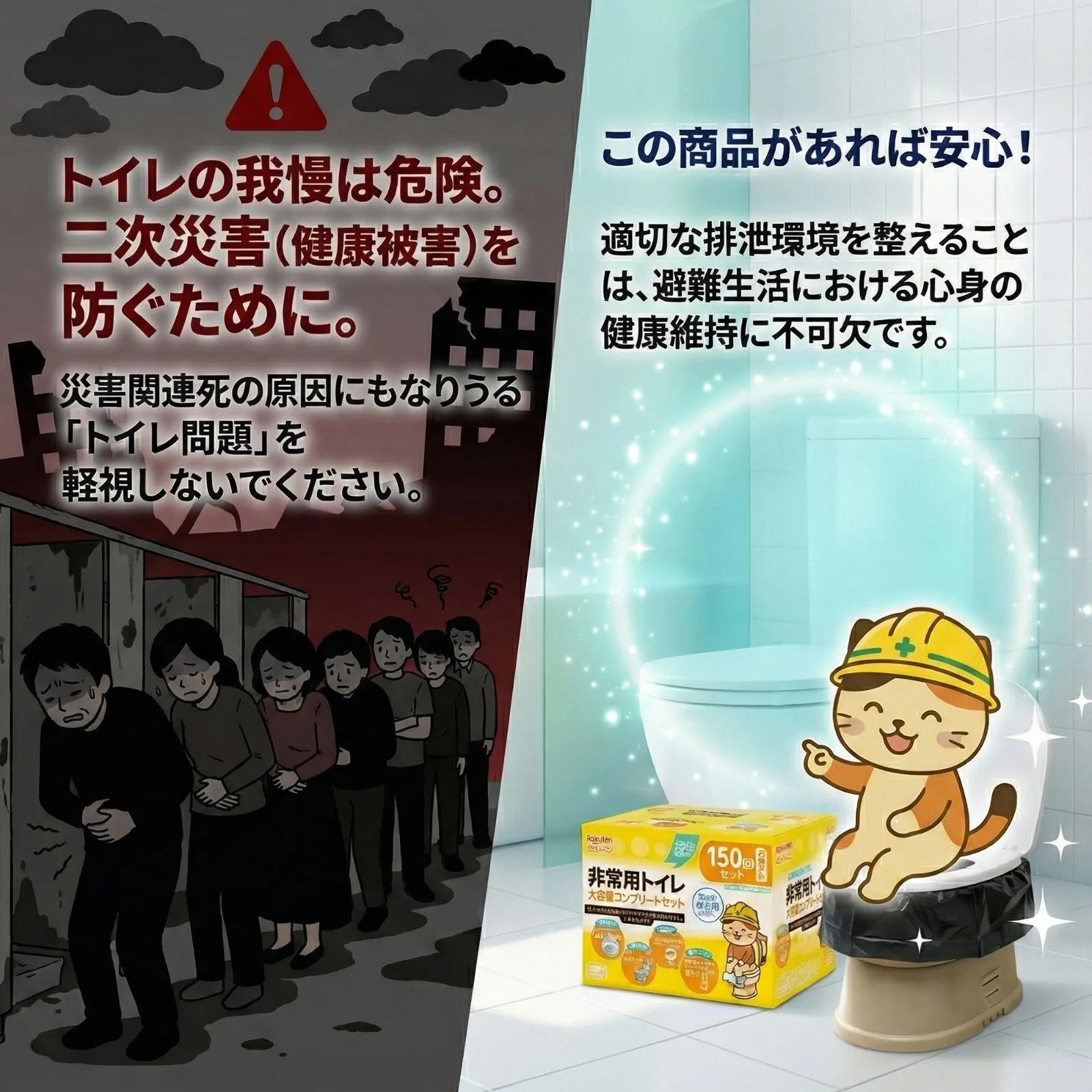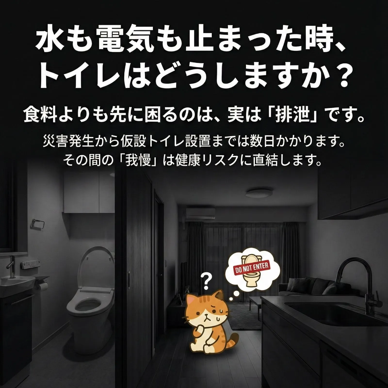 実は、災害時に食料よりも先に困るのが「排泄」です。仮設トイレが設置されるまでの数日間、我慢することは健康リスクに直結します。