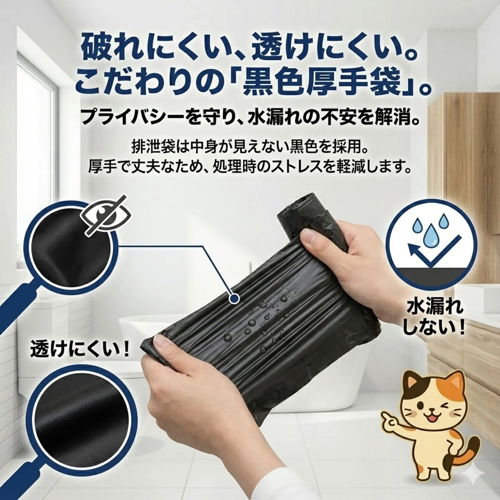 排泄袋は中身が見えない黒色を採用。厚手で丈夫なため、処理時の水漏れ不安やストレスを軽減し、プライバシーをしっかり守ります。