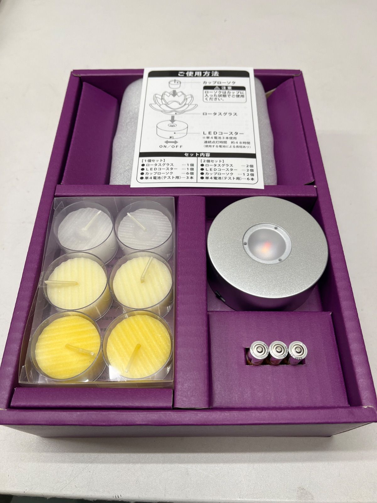 LEDコースターとあわせてご使用頂くとロータスグラス(ガラス製)が色の変化にあわせさまざまな表情で幻想的に浮かび上がり、お仏壇周りを華やかに彩ります。 中央に付属のローソクを置いて、ローソク立てとしても使用出来ます。 ※ライトは電池で灯りますので、簡単にご使用いただけます。 ※全宗派でお使い頂けます。 セット内容 ロータスグラス LEDコースター カップ付ローソク6個入り(燃焼時間およそ4時間/1個あたり) テスト用単電池 3本(アルカリ乾電池単4形) 新品未使用です 発送は平日のみになります
