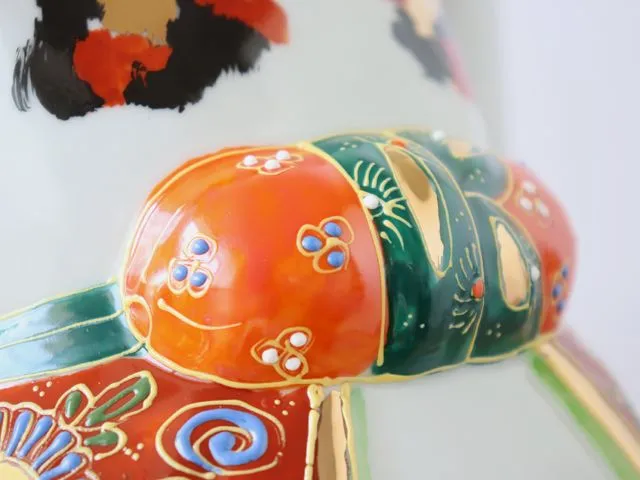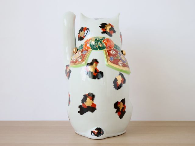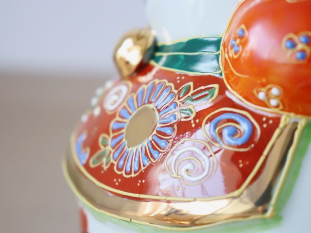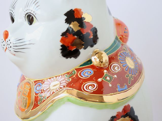 九谷焼にも様々な技法がある中で、この招き猫には「盛(もり)」技法を使用。イッチン(金具)で絵の具を立体的に盛り上げ、熟練の職人が一点一点丁寧に仕上げています。極彩色や金彩が美しく、オリエンタルな雰囲気が人気です。